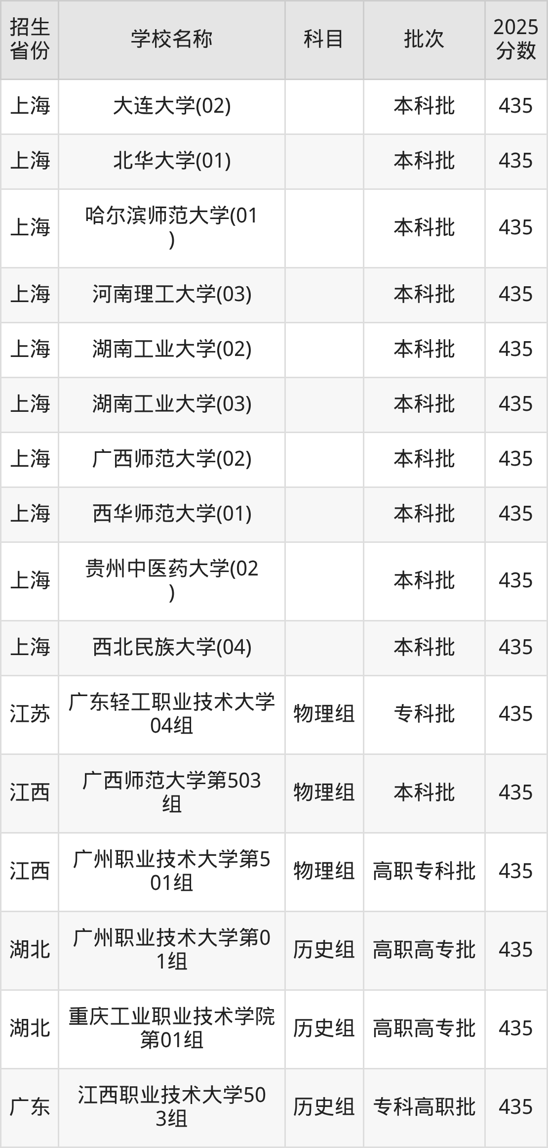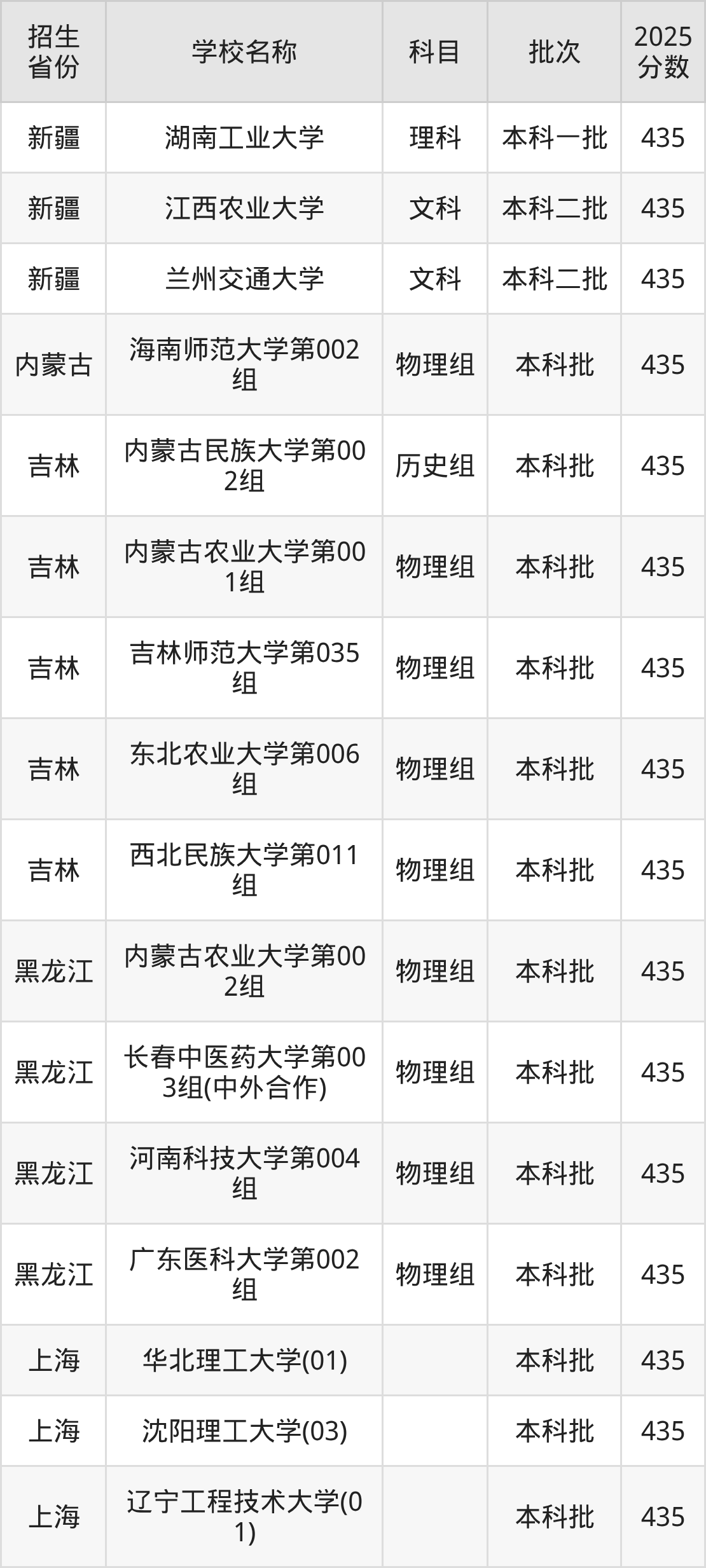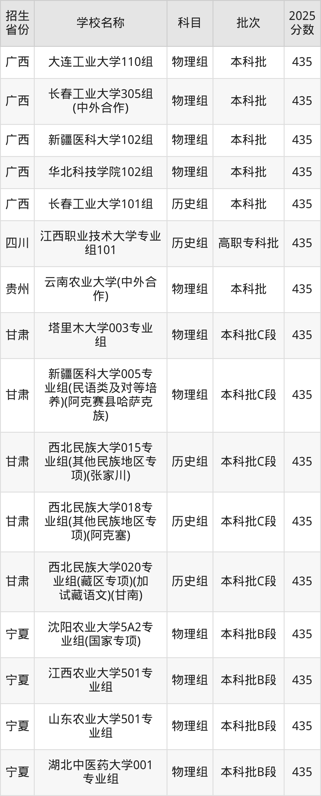 筛选全国各省2025年录取分数线为435分的重点大学如下: