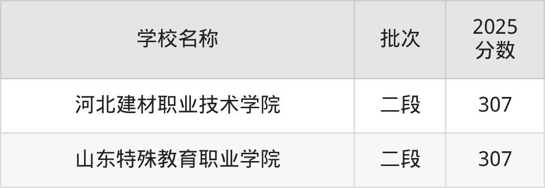 山东高考录取分数线在307分左右的公办大学一共有2所。分别是河北建材职业技术学院(307分)、山东特殊教育职业学院(307分)