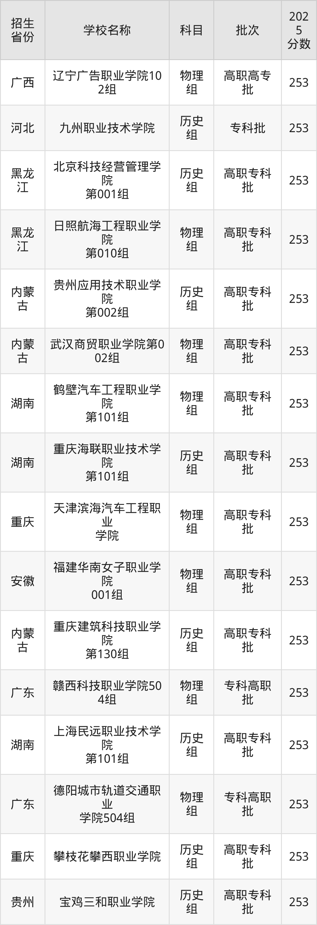 广东省物理组分数线是253分的民办专科学校有:赣西科技职业学院、德阳城市轨道交通职业学院。