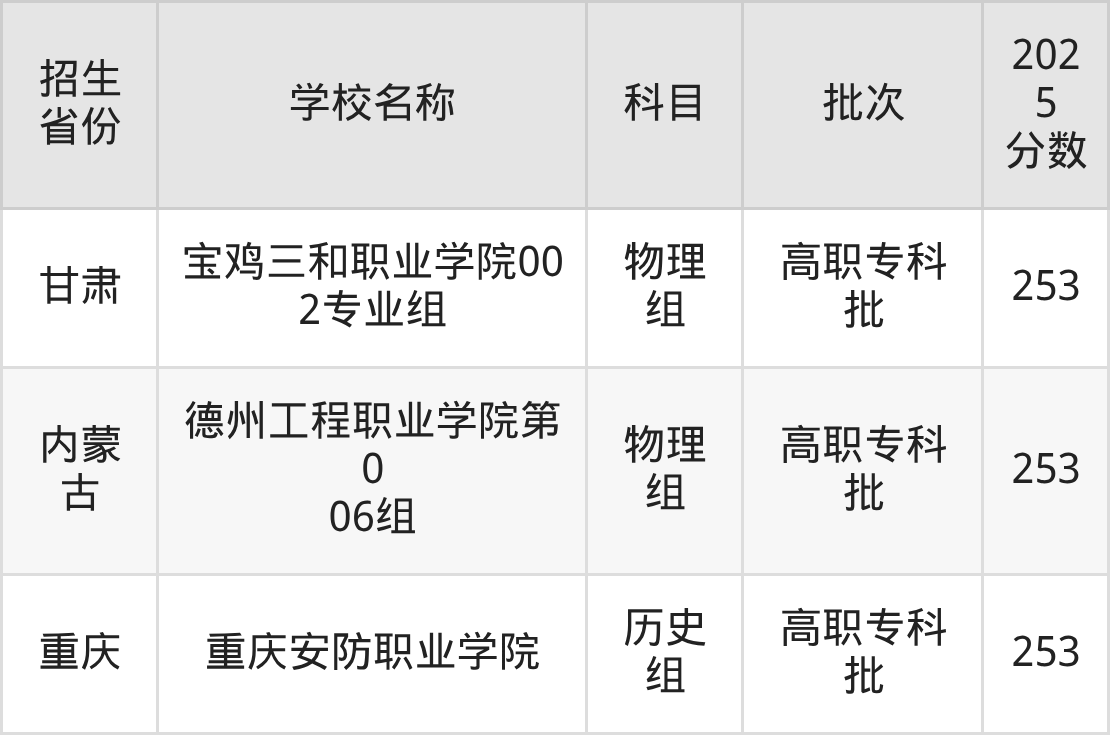 筛选全国各省2025年录取分数线为253分的民办专科学校如下: