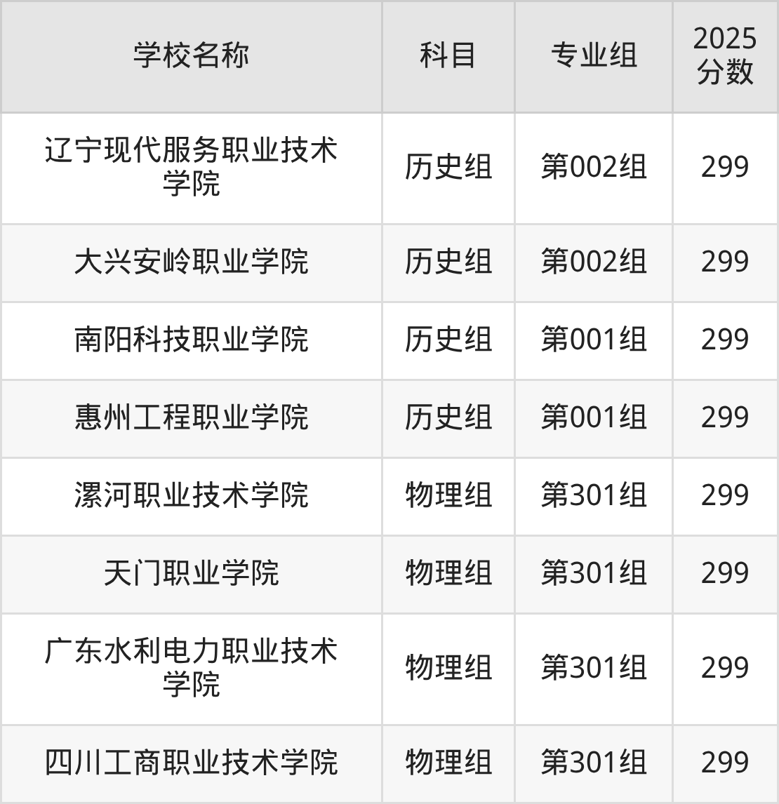 山西高考录取分数线在299分左右的公办院校专业组一共有8个,其中历史组有:辽宁现代服务职业技术学院(299分)、大兴安岭职业学院(299分)、南阳科技职业学院(299分),物理组有:漯河职业技术学院(299分)、天门职业学院(299分)、广东水利电力职业技术学院(299分)。