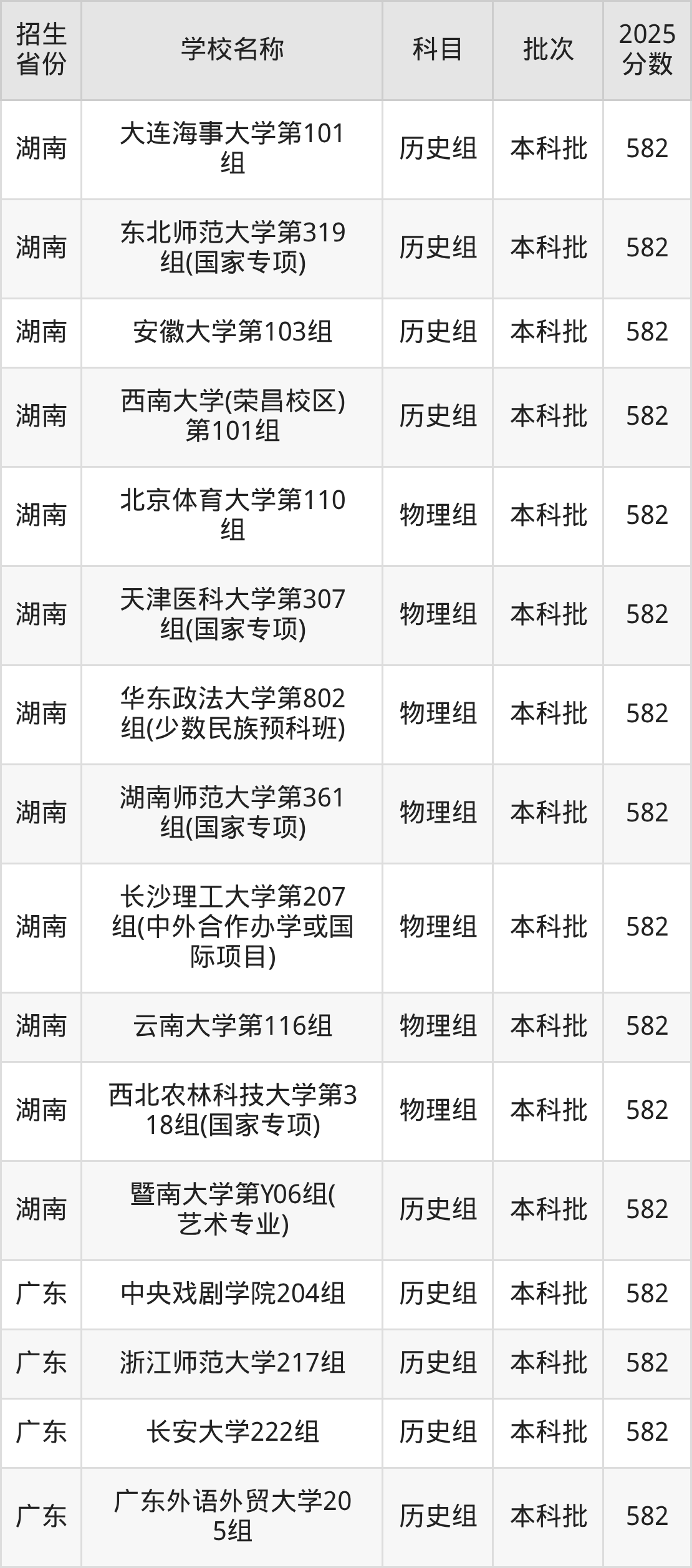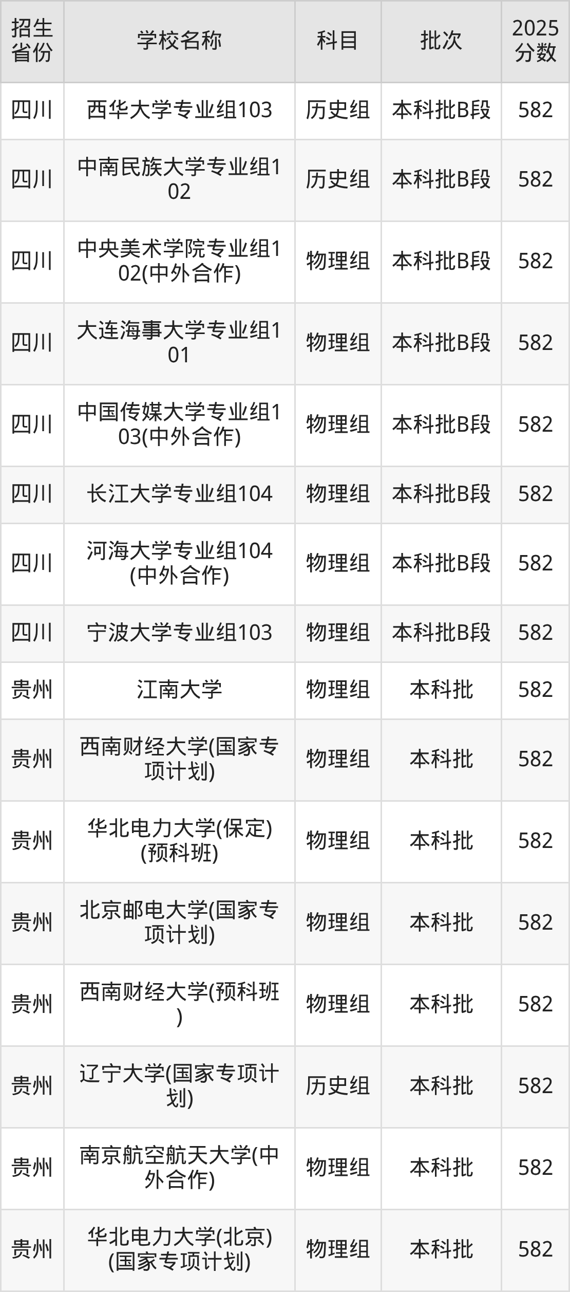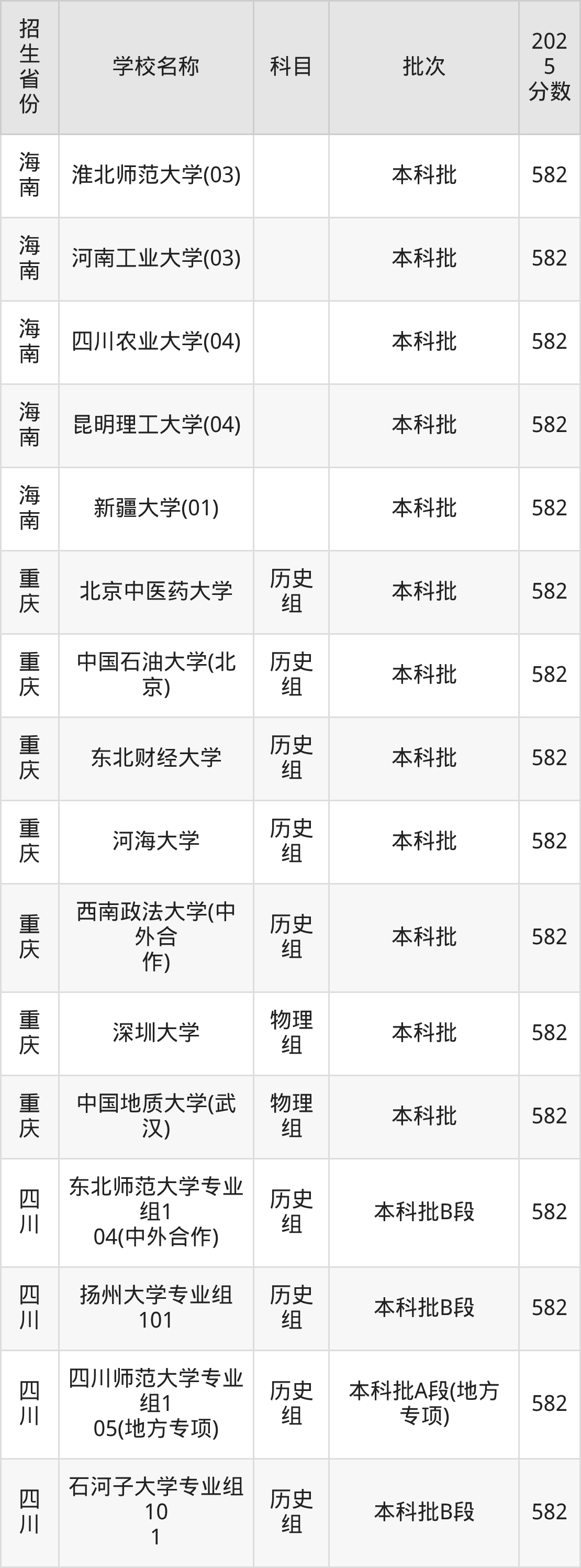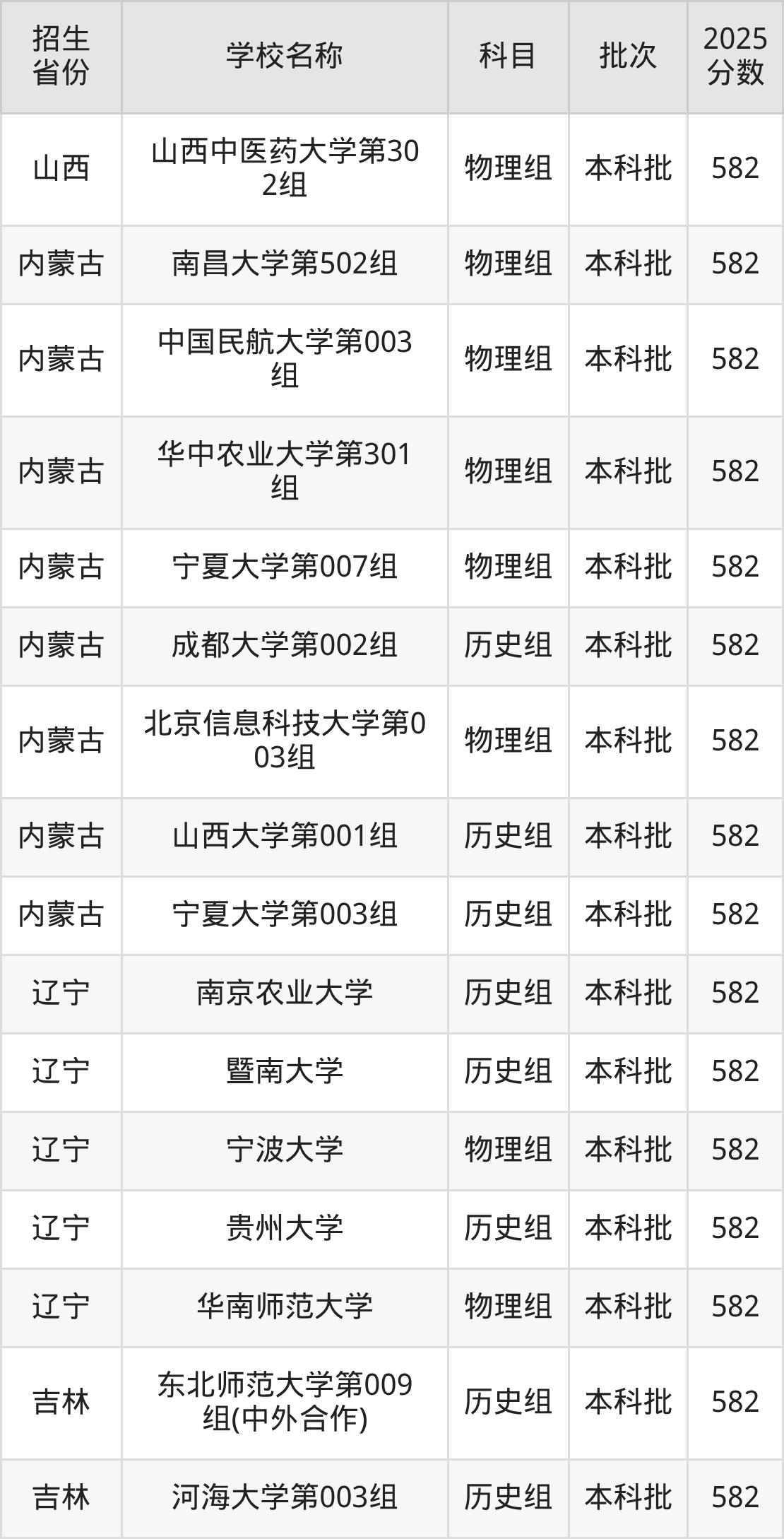 筛选全国各省2025年录取分数线为582分的重点大学如下: