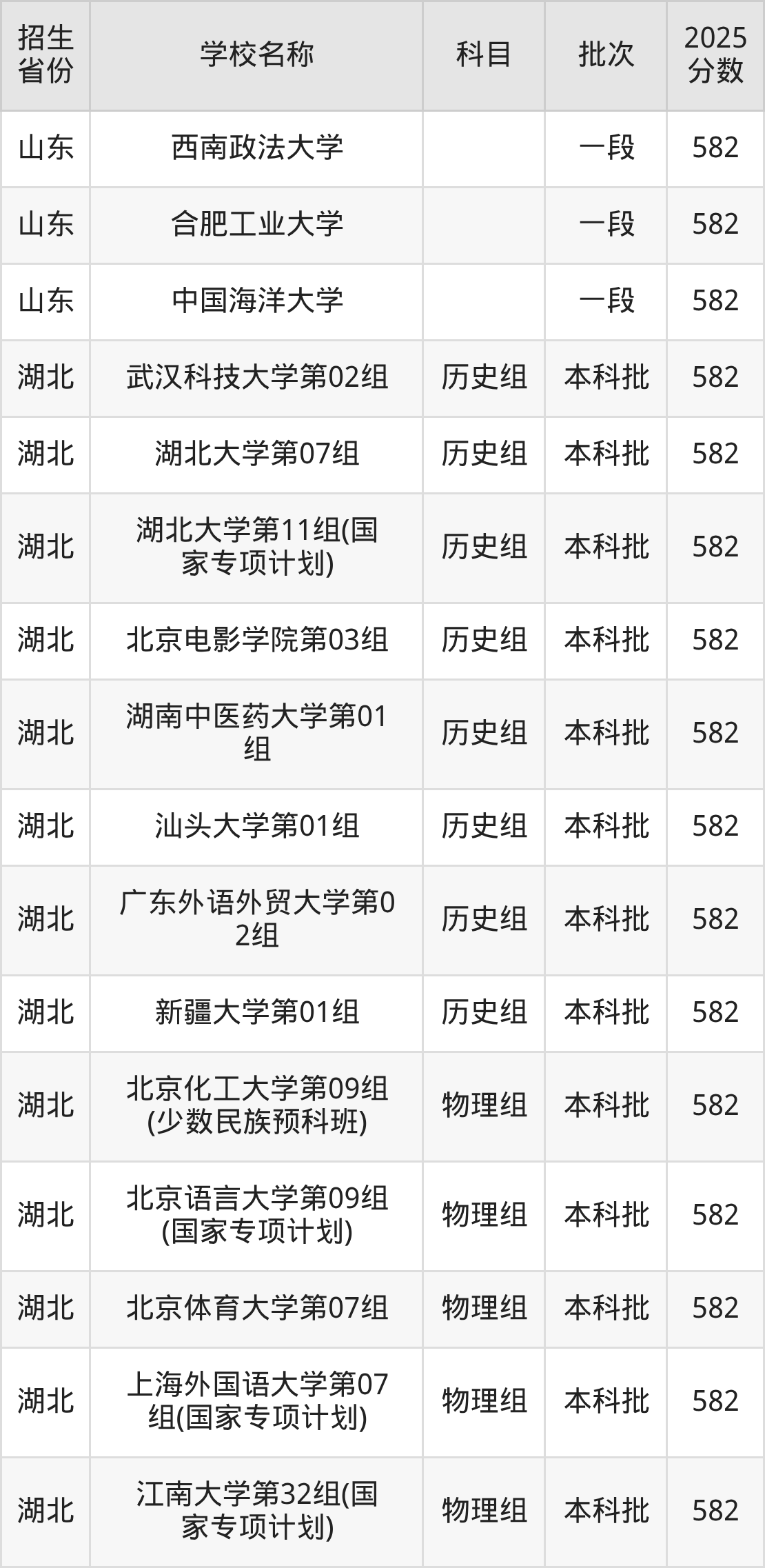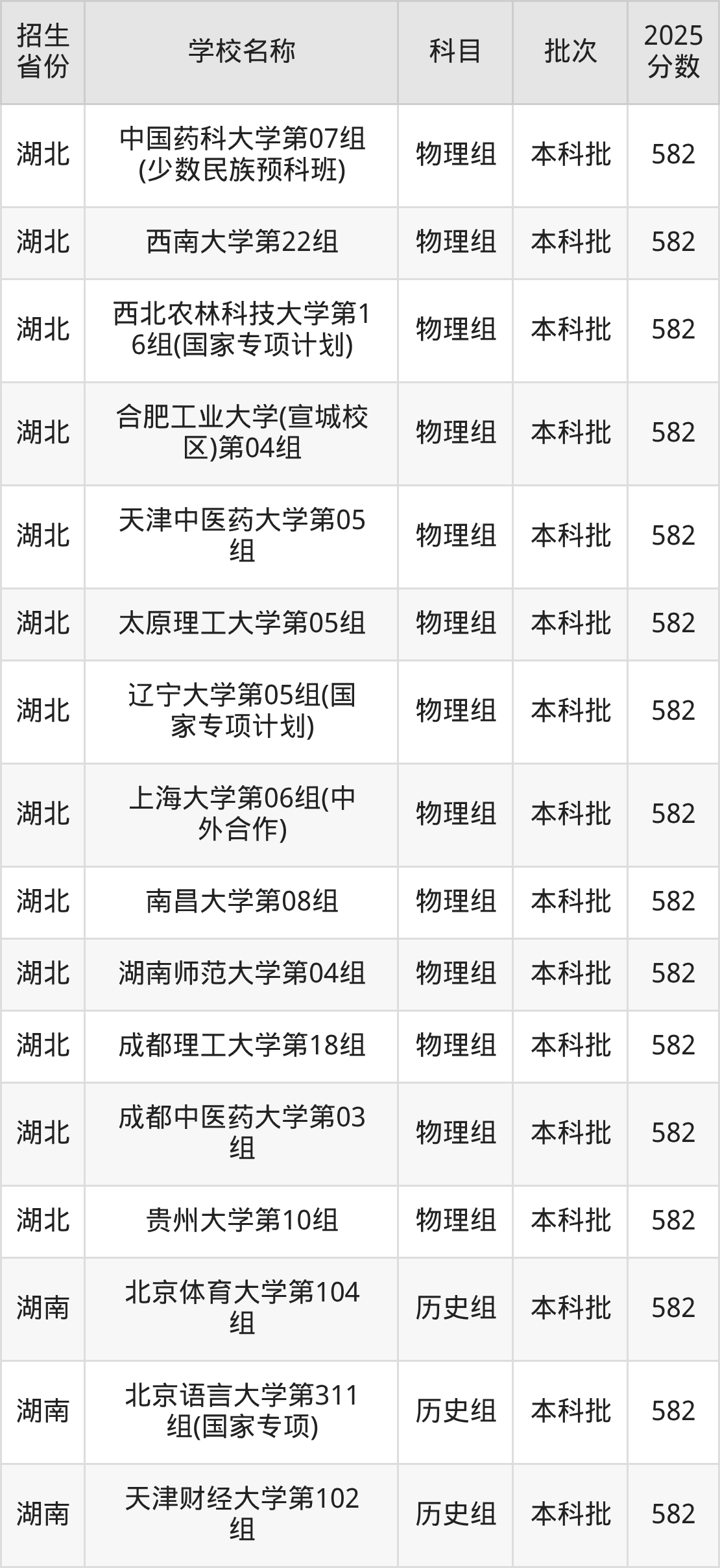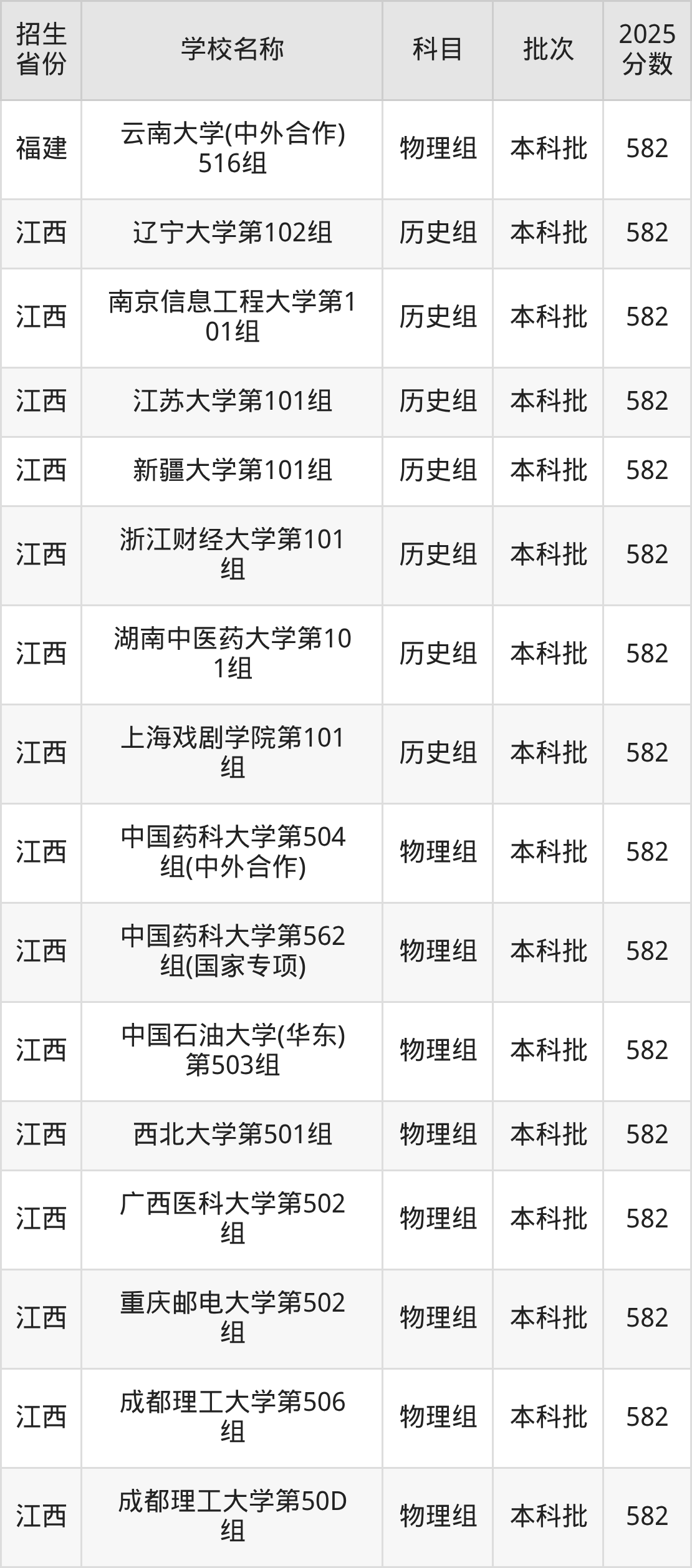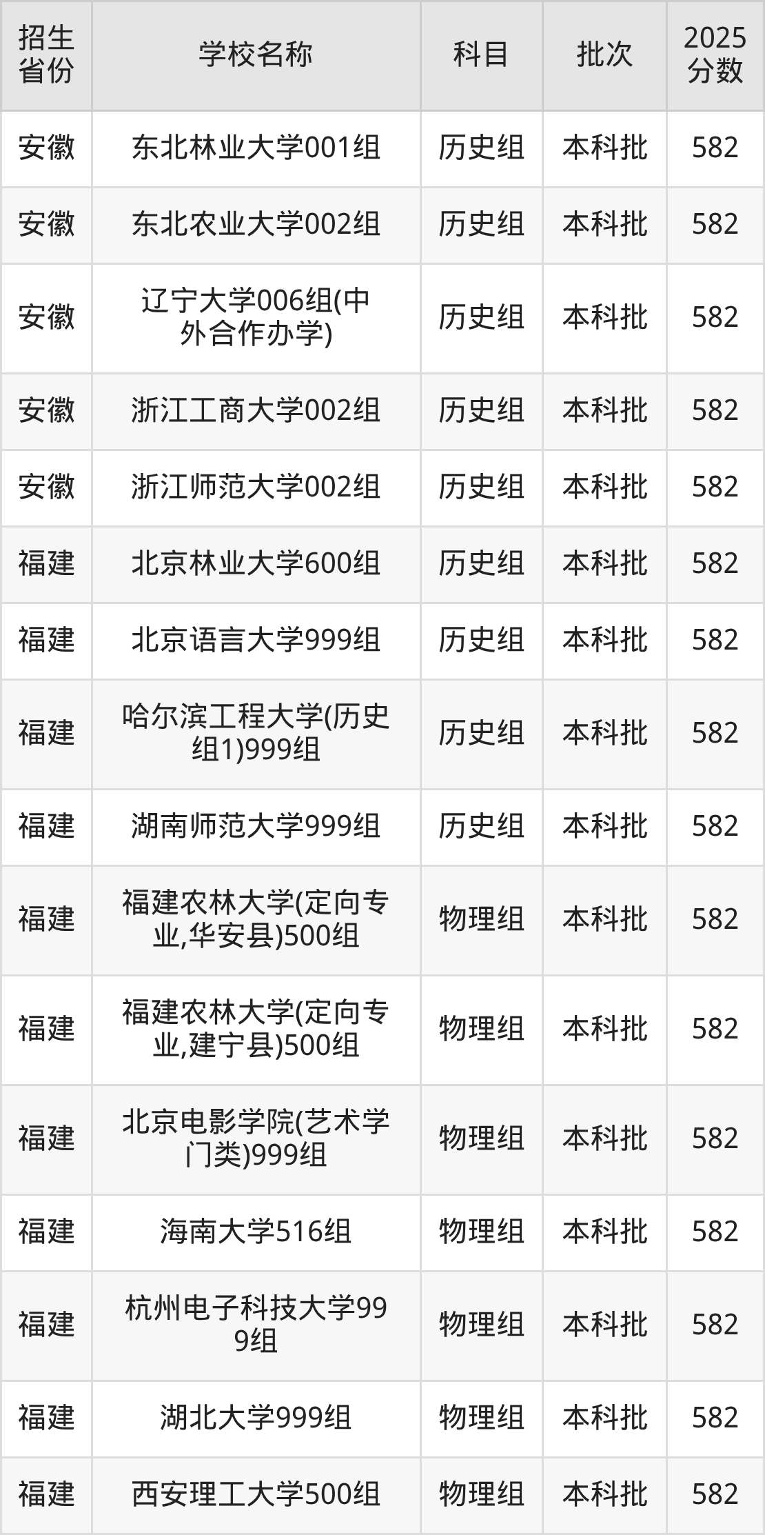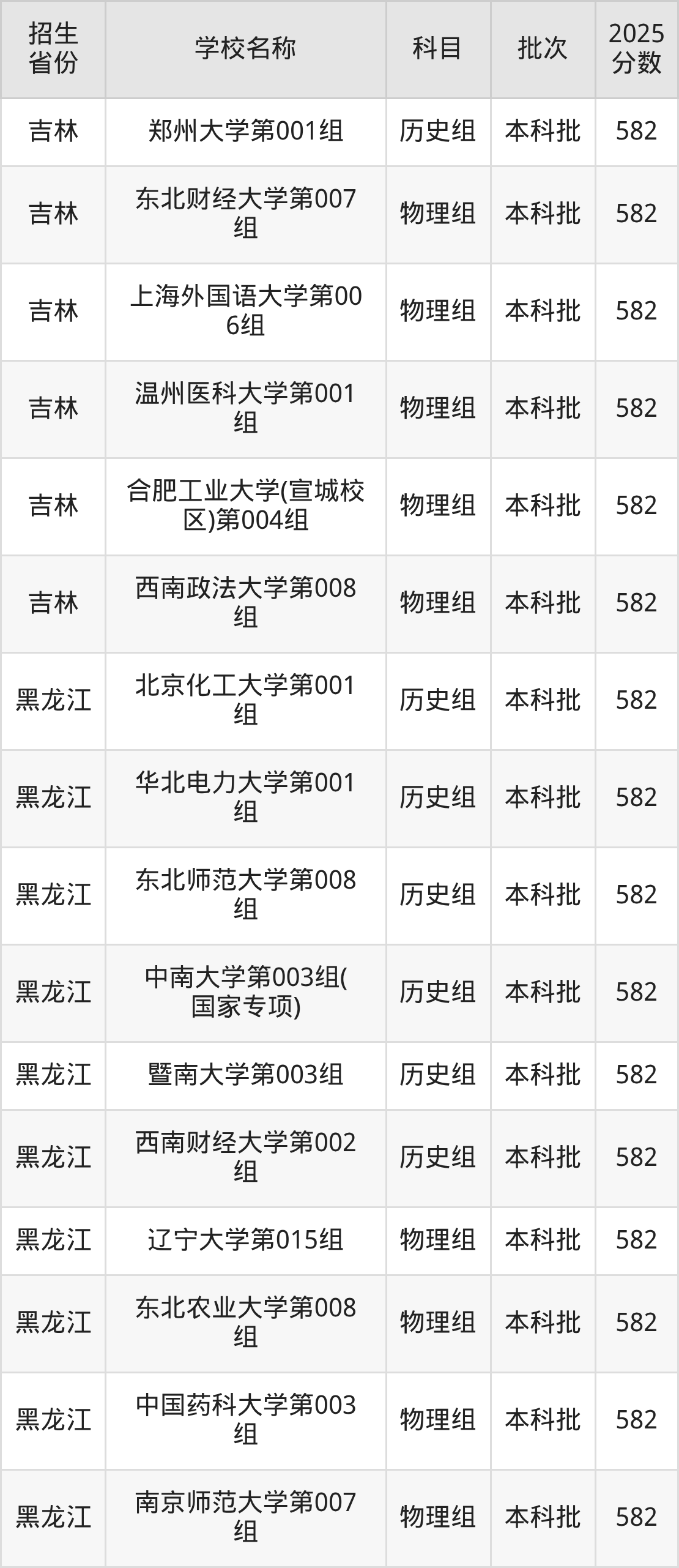 筛选全国各省2025年录取分数线为582分的重点大学如下: