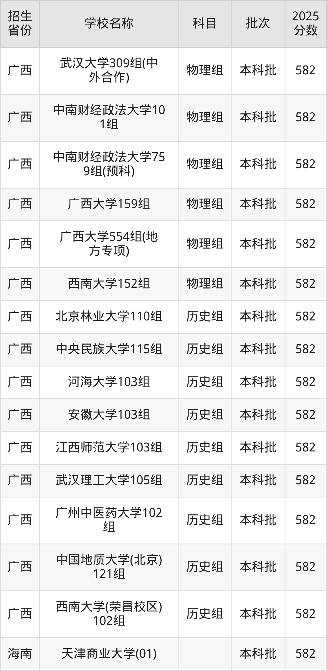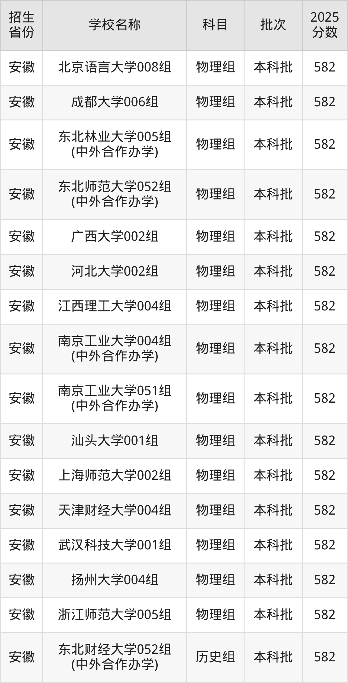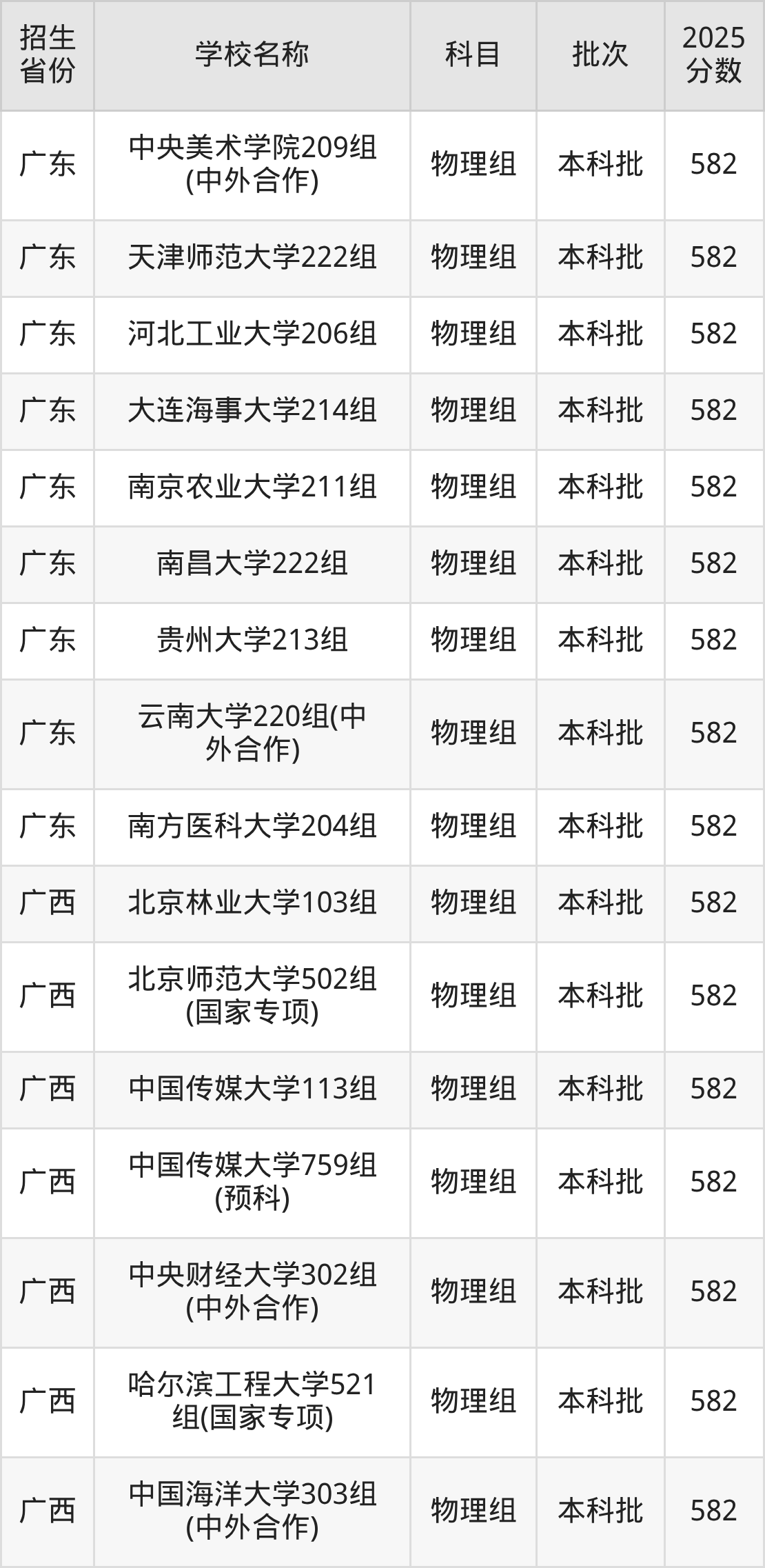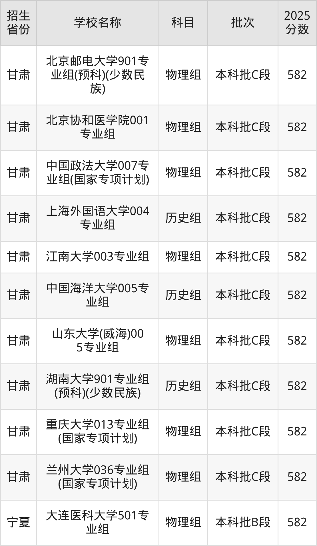 筛选全国各省2025年录取分数线为582分的重点大学如下: