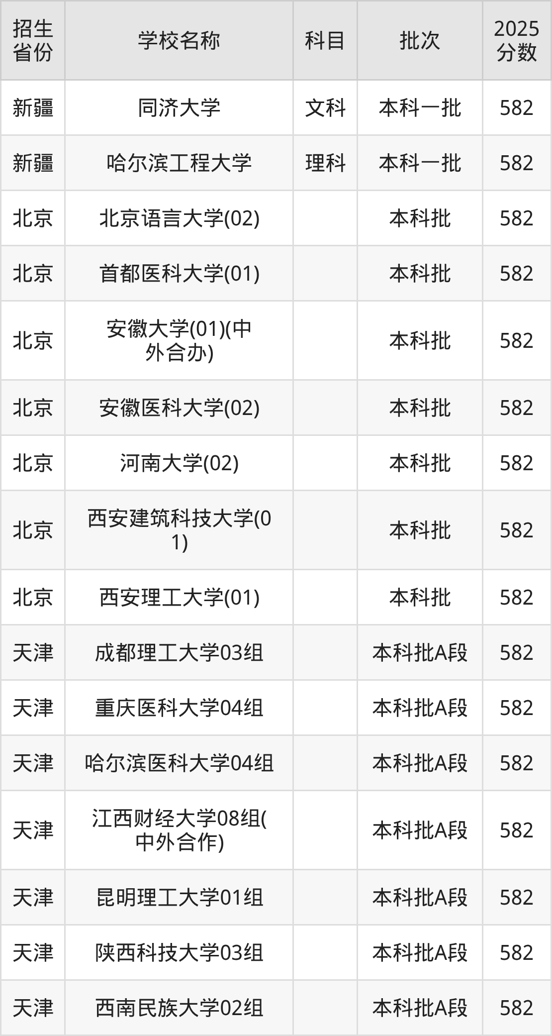 582分可以上的大学有同济大学、哈尔滨工程大学、北京语言大学、首都医科大学等重点大学。本文整理了湖北、广西等全国582分左右的重点大学名单,请2026年高考生参考。