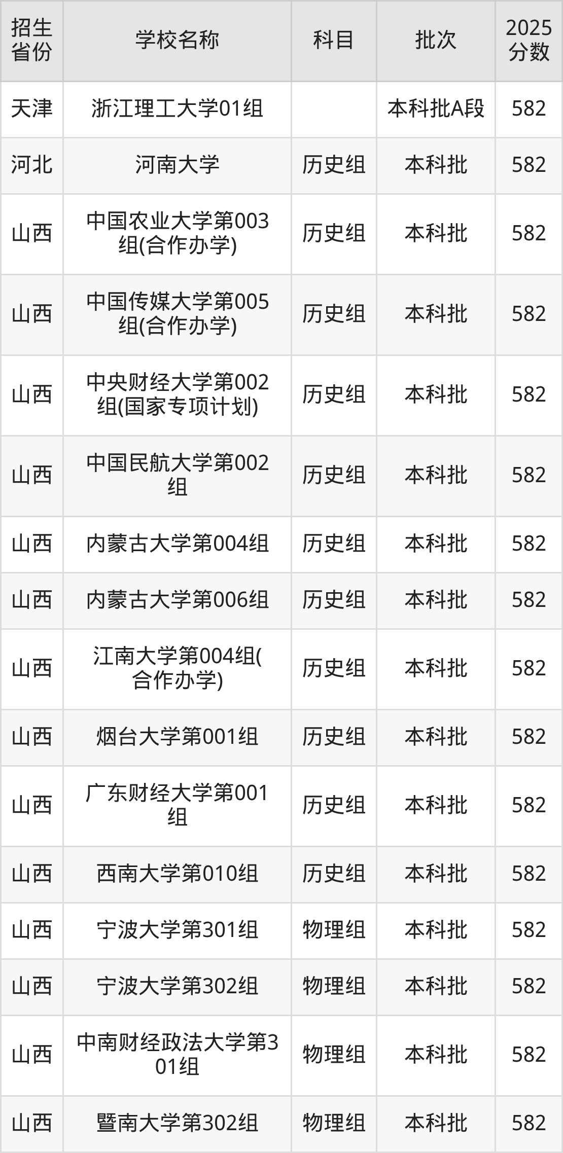 山西省历史组分数线是582分的重点大学有:中国农业大学、中国传媒大学、中央财经大学、中国民航大学、内蒙古大学、江南大学、烟台大学、广东财经大学、西南大学。