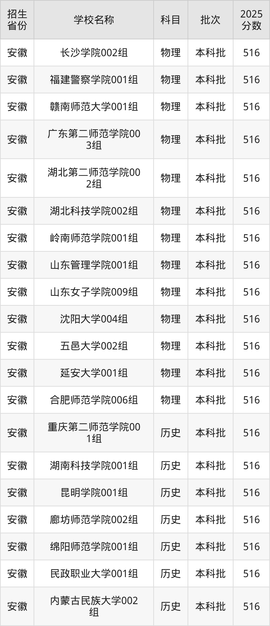 安徽省物理组分数线是516分的文科大学有:长沙学院、福建警察学院、赣南师范大学、广东第二师范学院、湖北第二师范学院、湖北科技学院、岭南师范学院、山东管理学院、山东女子学院、沈阳大学。