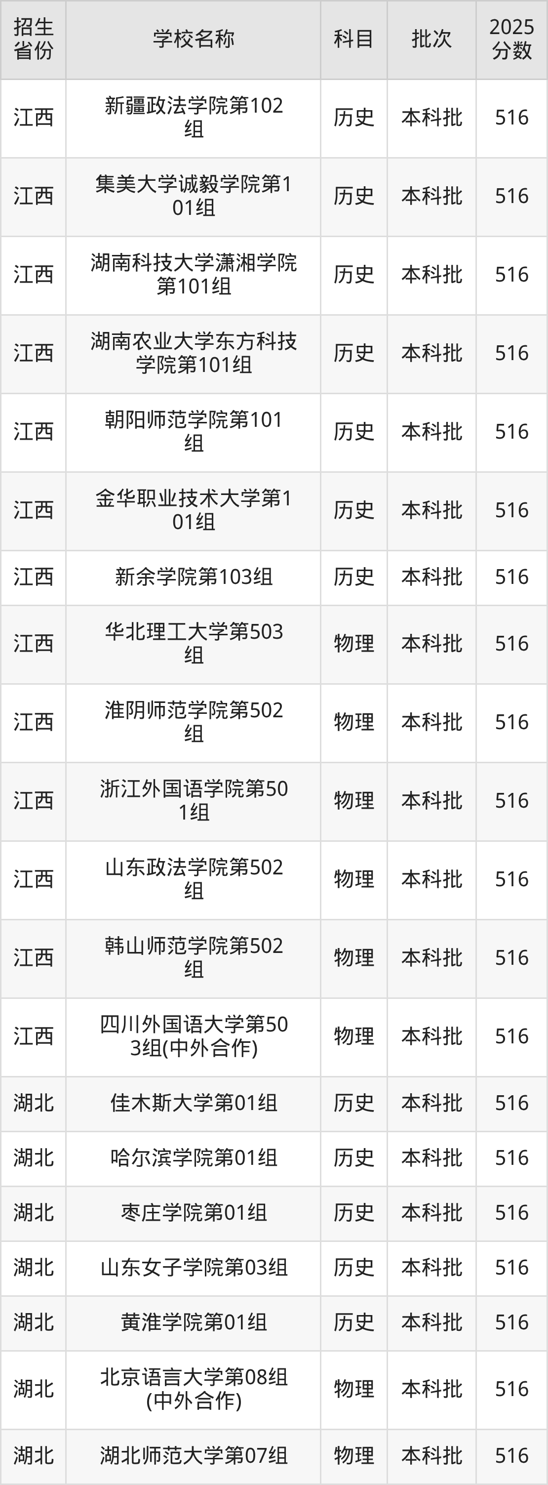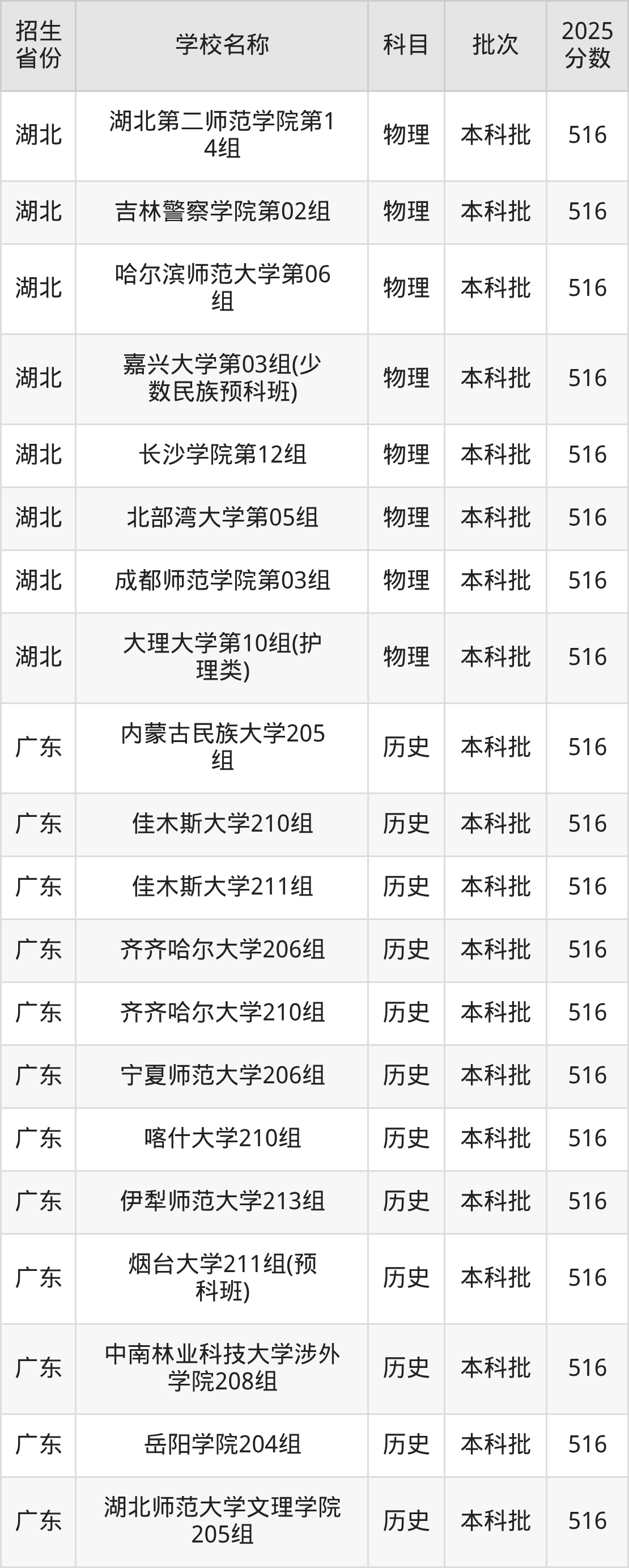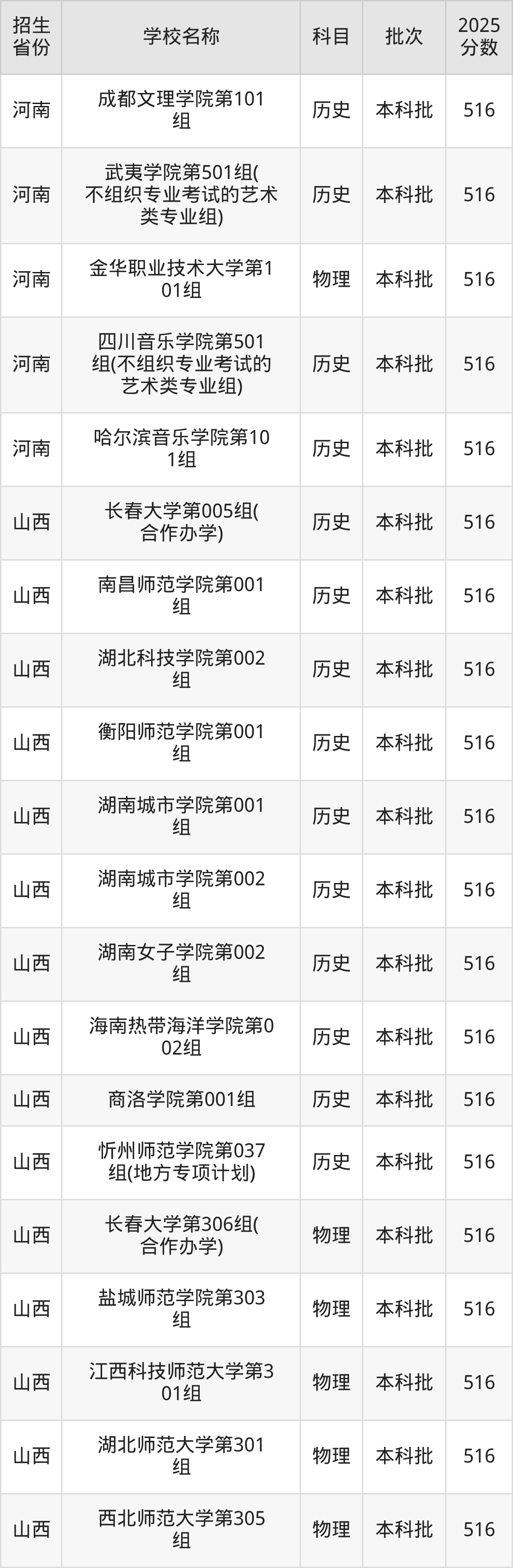 筛选全国各省2025年录取分数线为516分的文科大学如下: