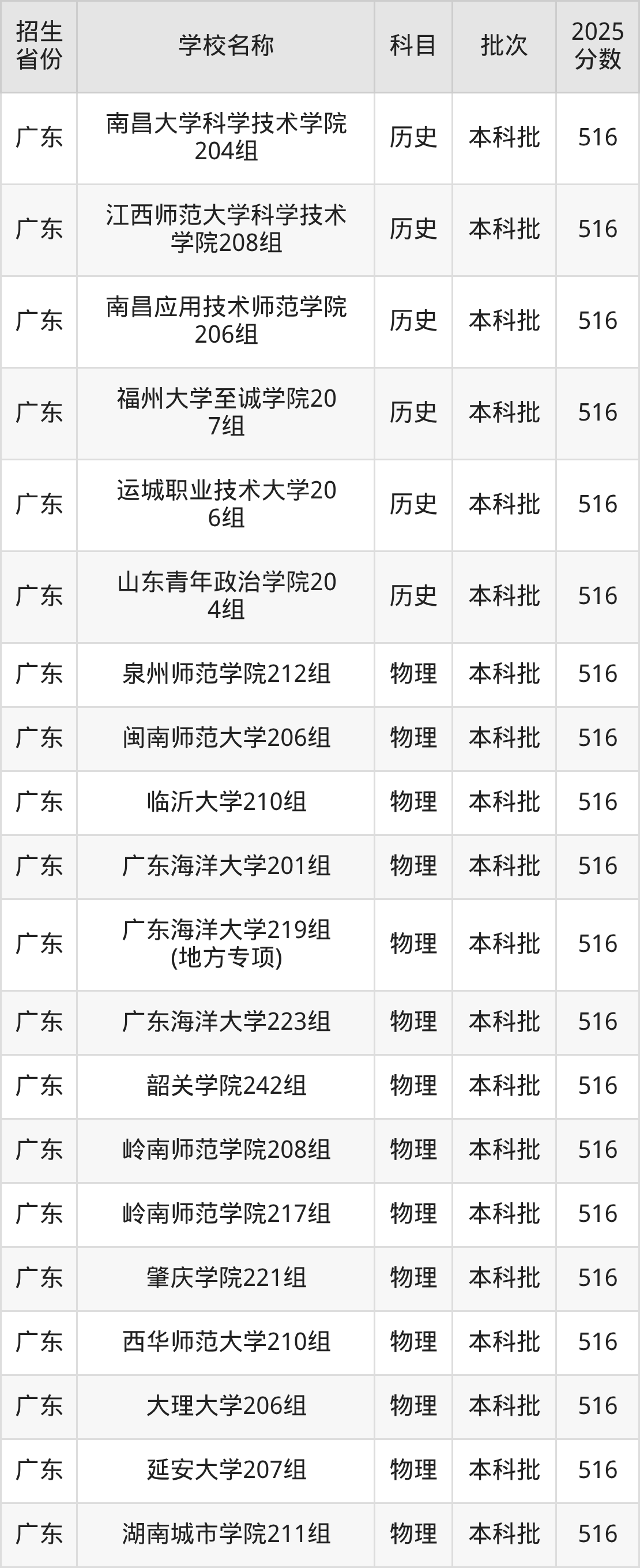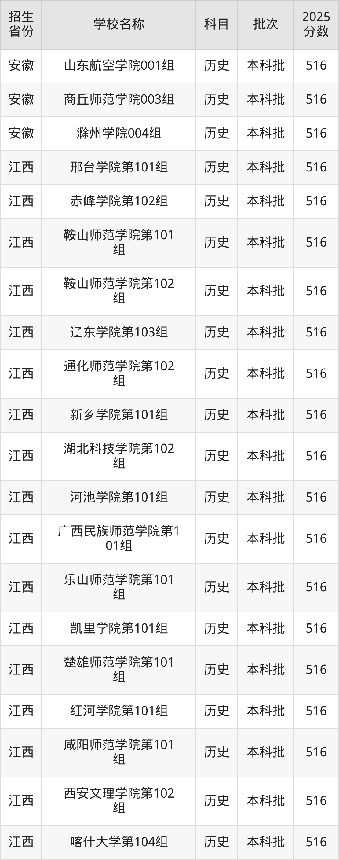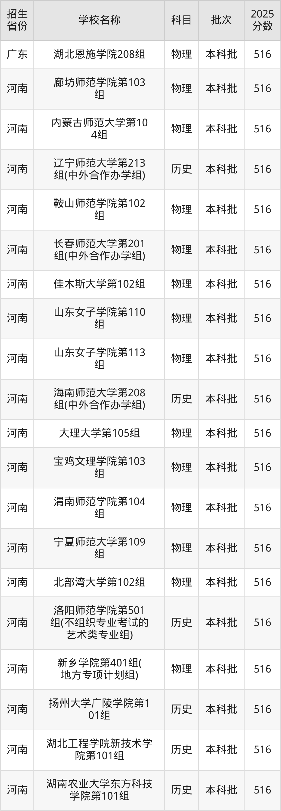 筛选全国各省2025年录取分数线为516分的文科大学如下: