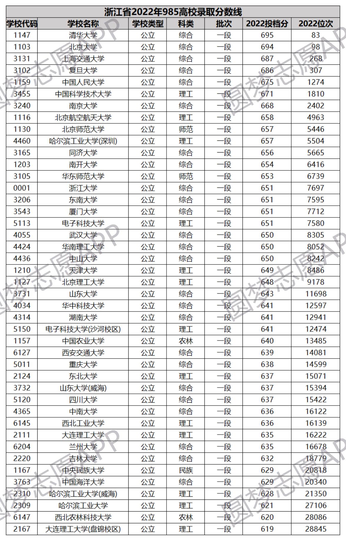 2022浙江录取分数线较高的十所985大学分别是: