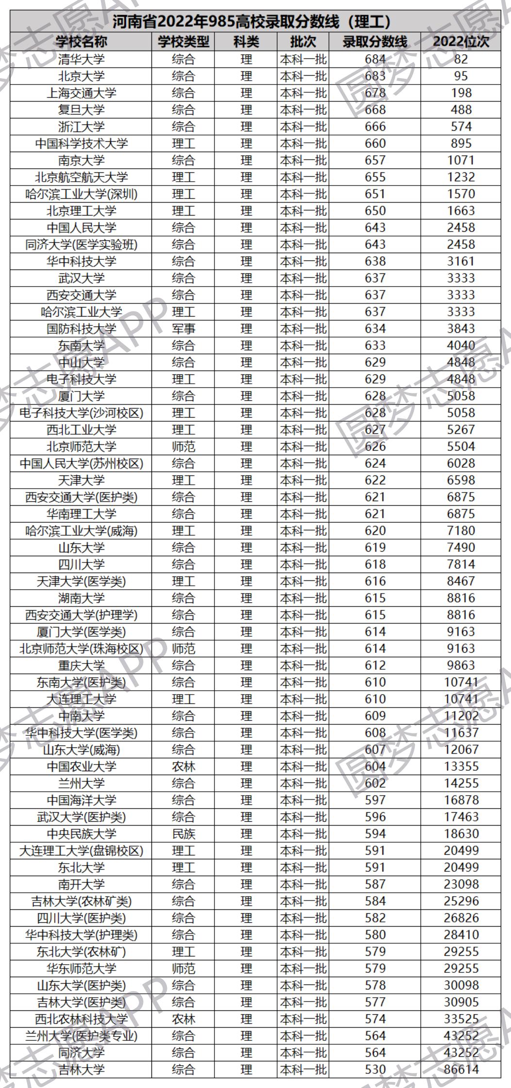 2022年河南理科分数线较高的985大学有: