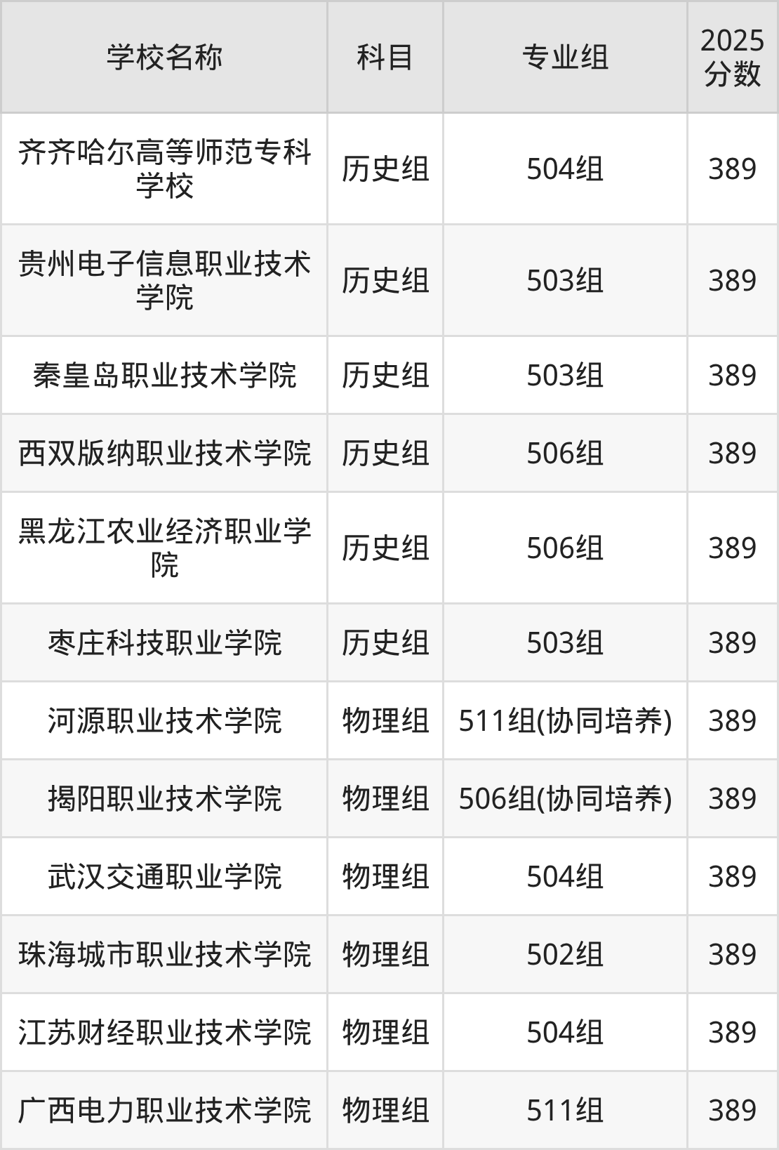 广东高考录取分数线在389分左右的公办院校专业组一共有12个,其中历史组有:齐齐哈尔高等师范专科学校(389分)、贵州电子信息职业技术学院(389分)、秦皇岛职业技术学院(389分),物理组有:河源职业技术学院(389分)、揭阳职业技术学院(389分)、武汉交通职业学院(389分)。