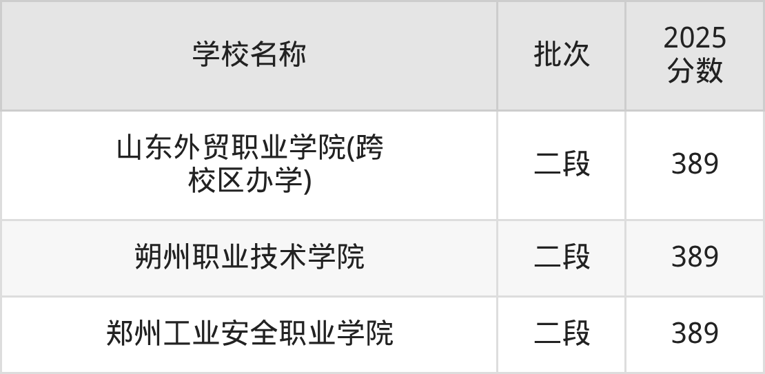 山东高考录取分数线在389分左右的公办大学一共有3所。分别是山东外贸职业学院(跨校区办学)(389分)、朔州职业技术学院(389分)、郑州工业安全职业学院(389分)