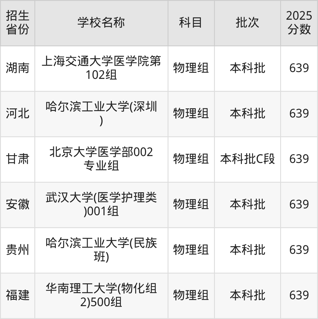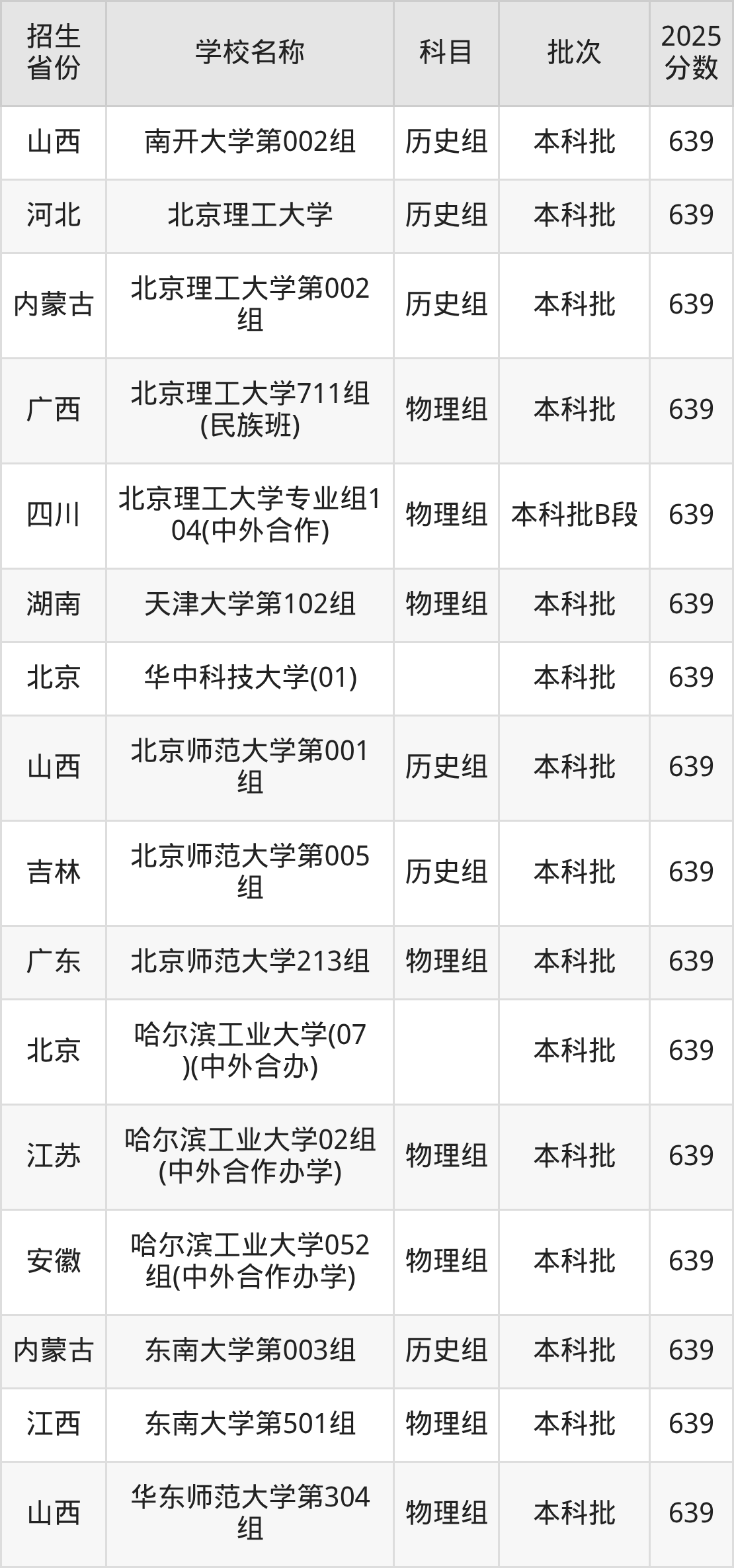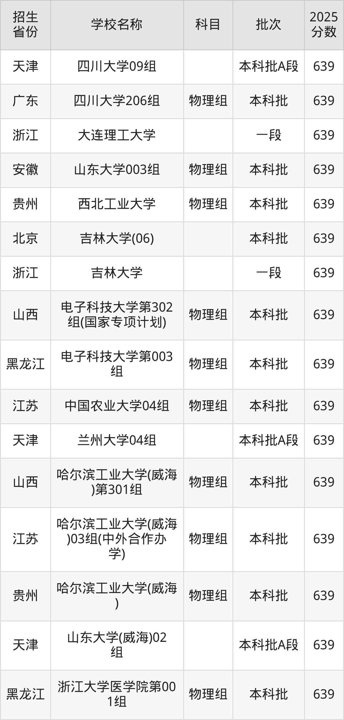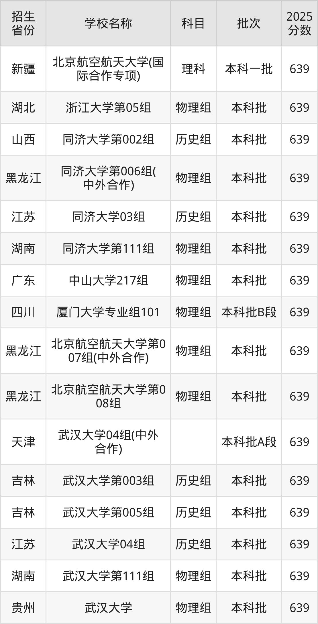 筛选全国各省2025年录取分数线为639分的985大学如下: