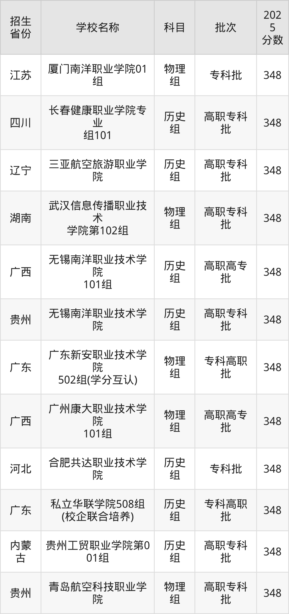 筛选全国各省2025年录取分数线为348分的民办专科学校如下: