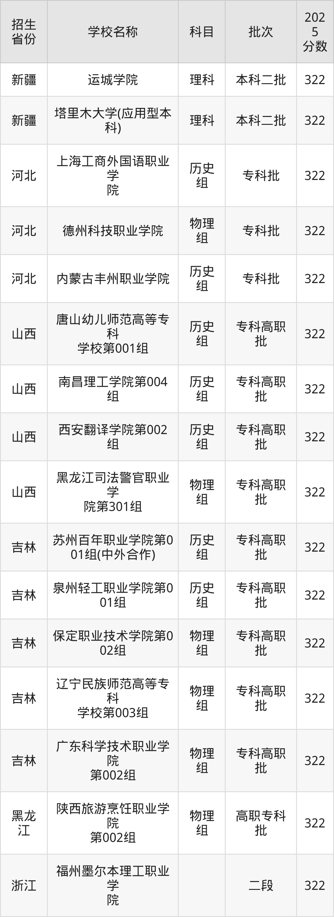 筛选全国各省2025年录取分数线为322分的文科大学如下: