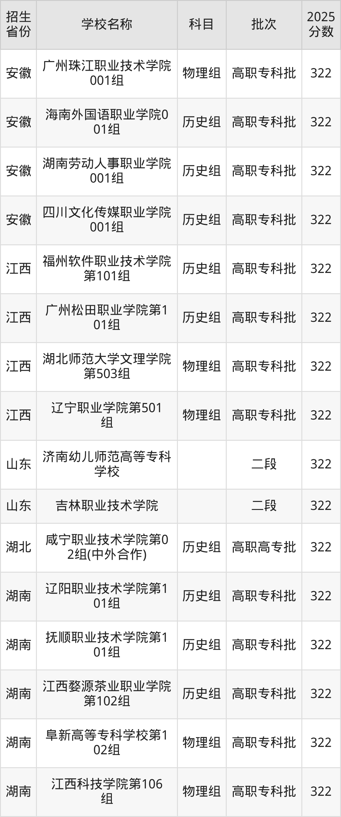 湖南省物理组分数线是322分的文科大学有:阜新高等专科学校、江西科技学院。