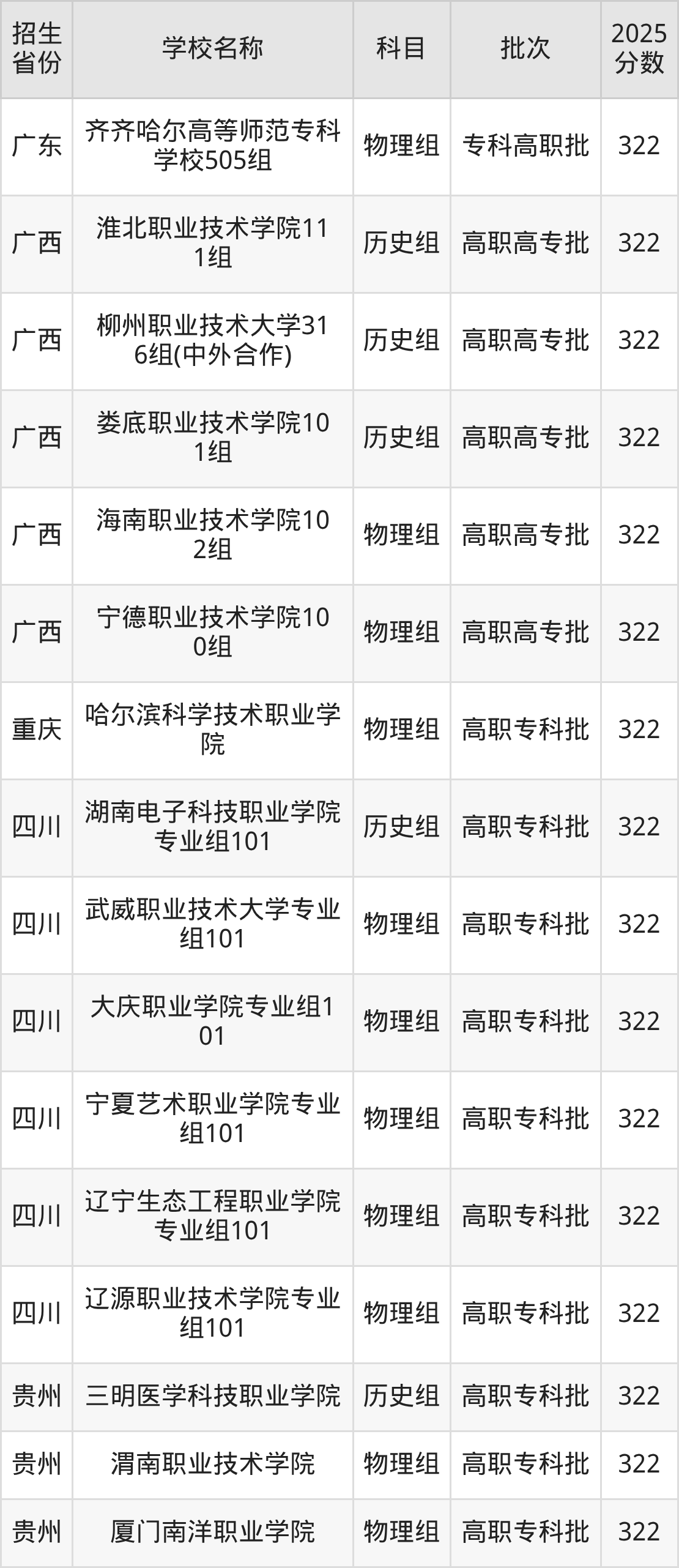 广西壮族自治区物理组分数线是322分的文科大学有:海南职业技术学院、宁德职业技术学院。