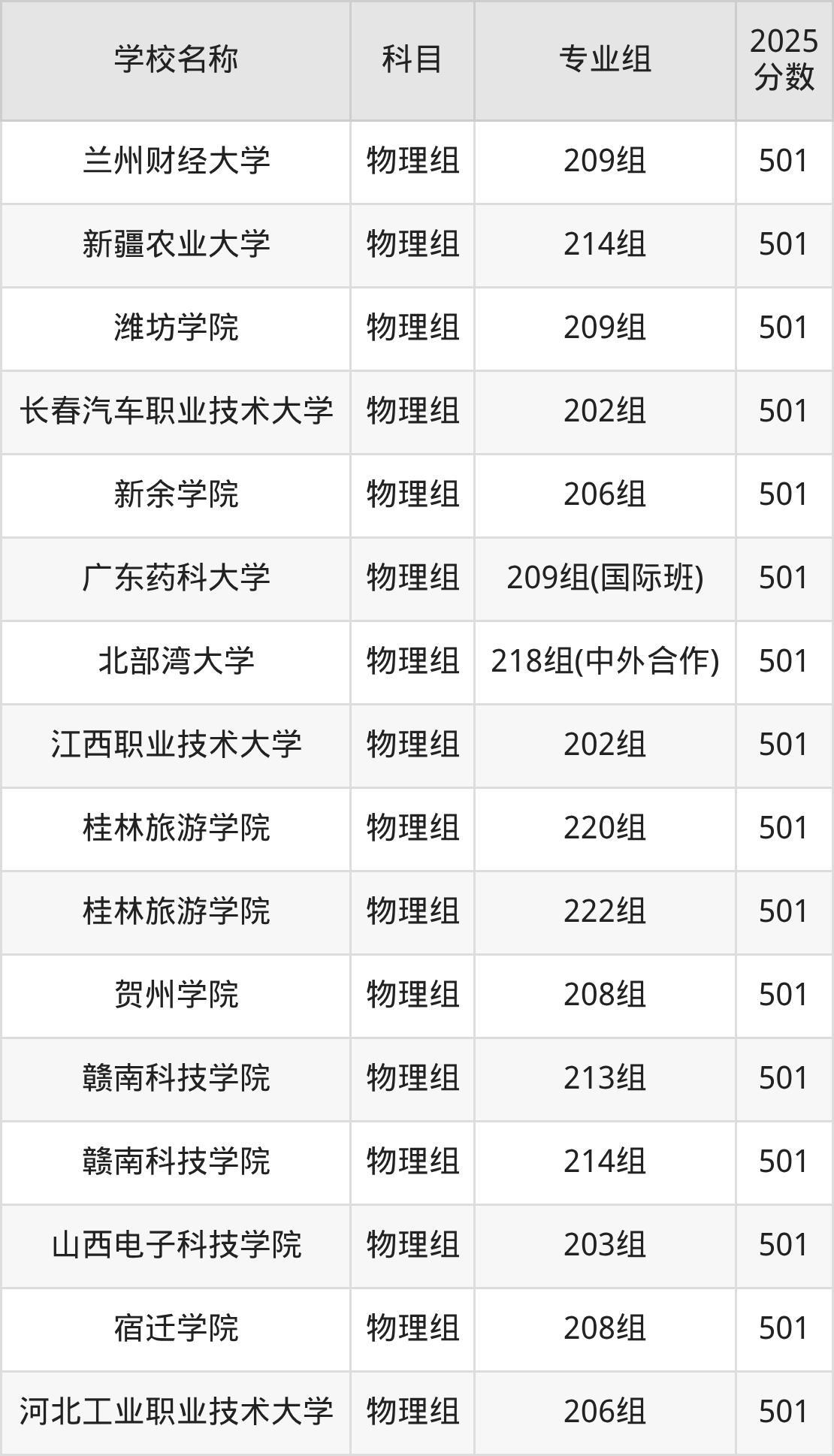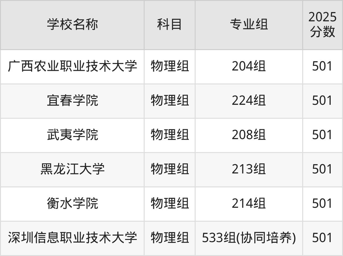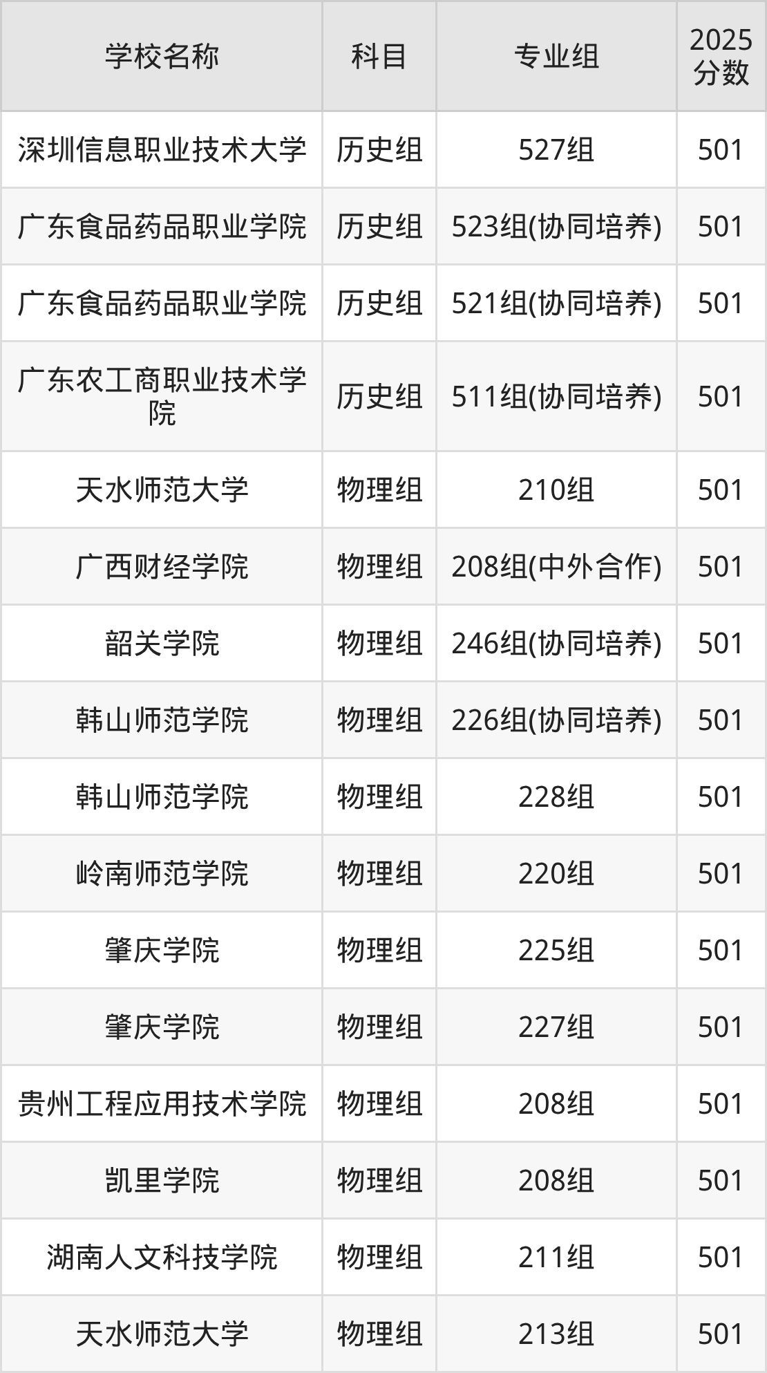 广东高考录取分数线在501分左右的公办院校专业组一共有38个,其中历史组有:深圳信息职业技术大学(501分)、广东食品药品职业学院(501分)、广东农工商职业技术学院(501分),物理组有:天水师范大学(501分)、广西财经学院(501分)、韶关学院(501分)。