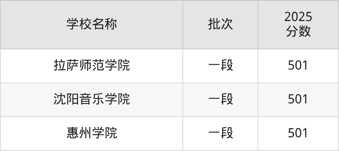 山东高考录取分数线在501分左右的公办大学一共有3所。分别是拉萨师范学院(501分)、沈阳音乐学院(501分)、惠州学院(501分)