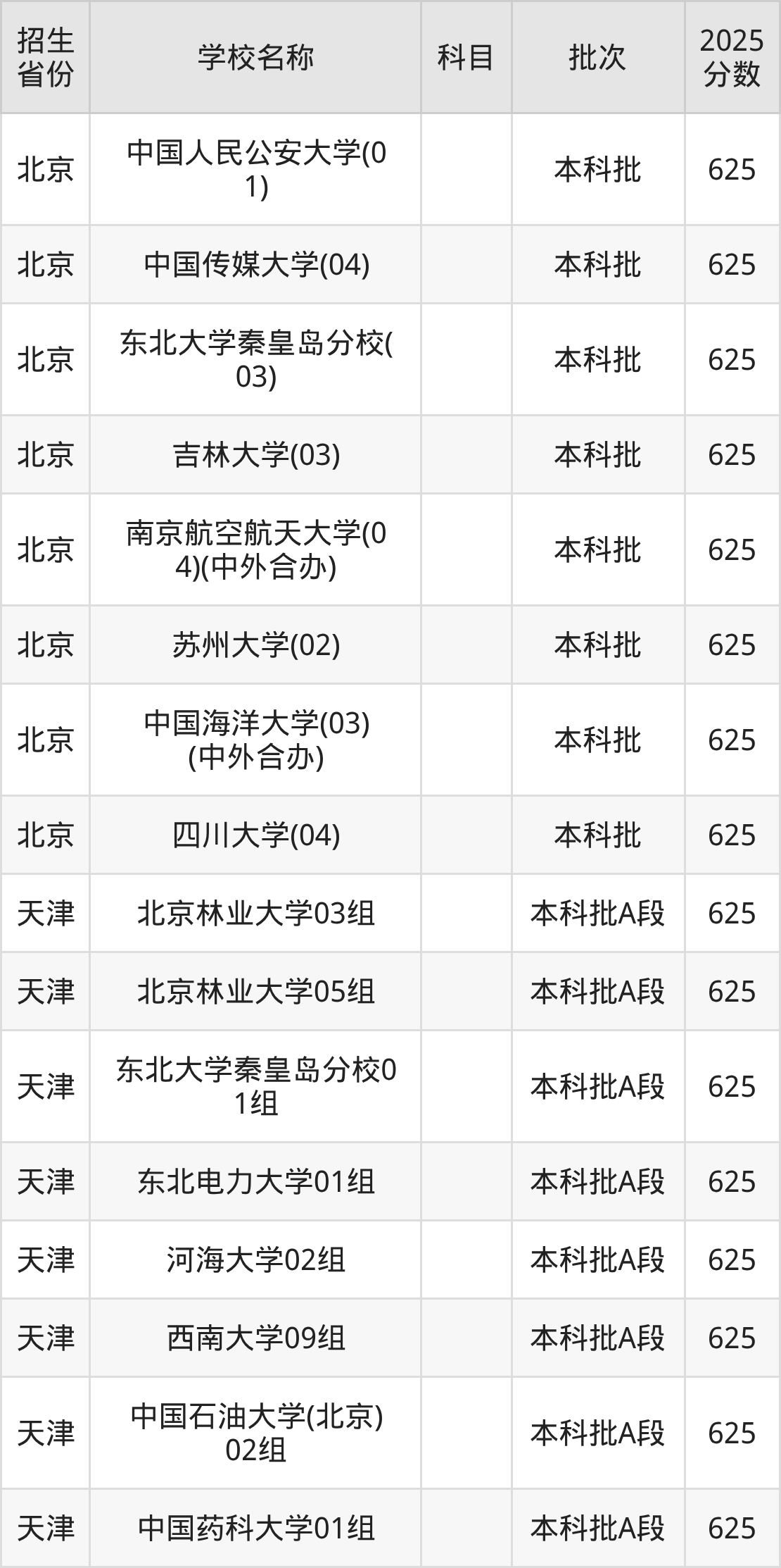 北京市分数线是625分的重点大学有:中国人民公安大学、中国传媒大学、东北大学秦皇岛分校、吉林大学、南京航空航天大学、苏州大学、中国海洋大学、四川大学。
