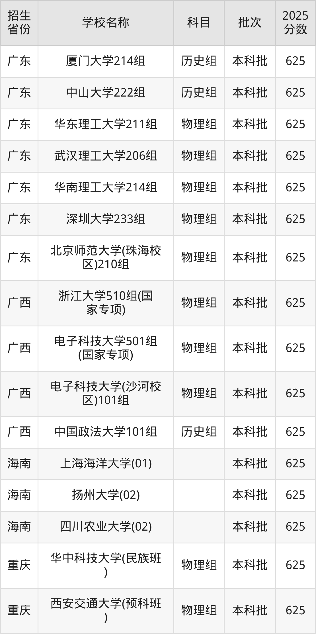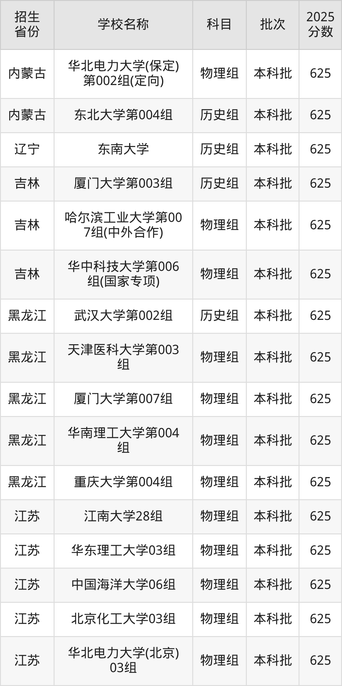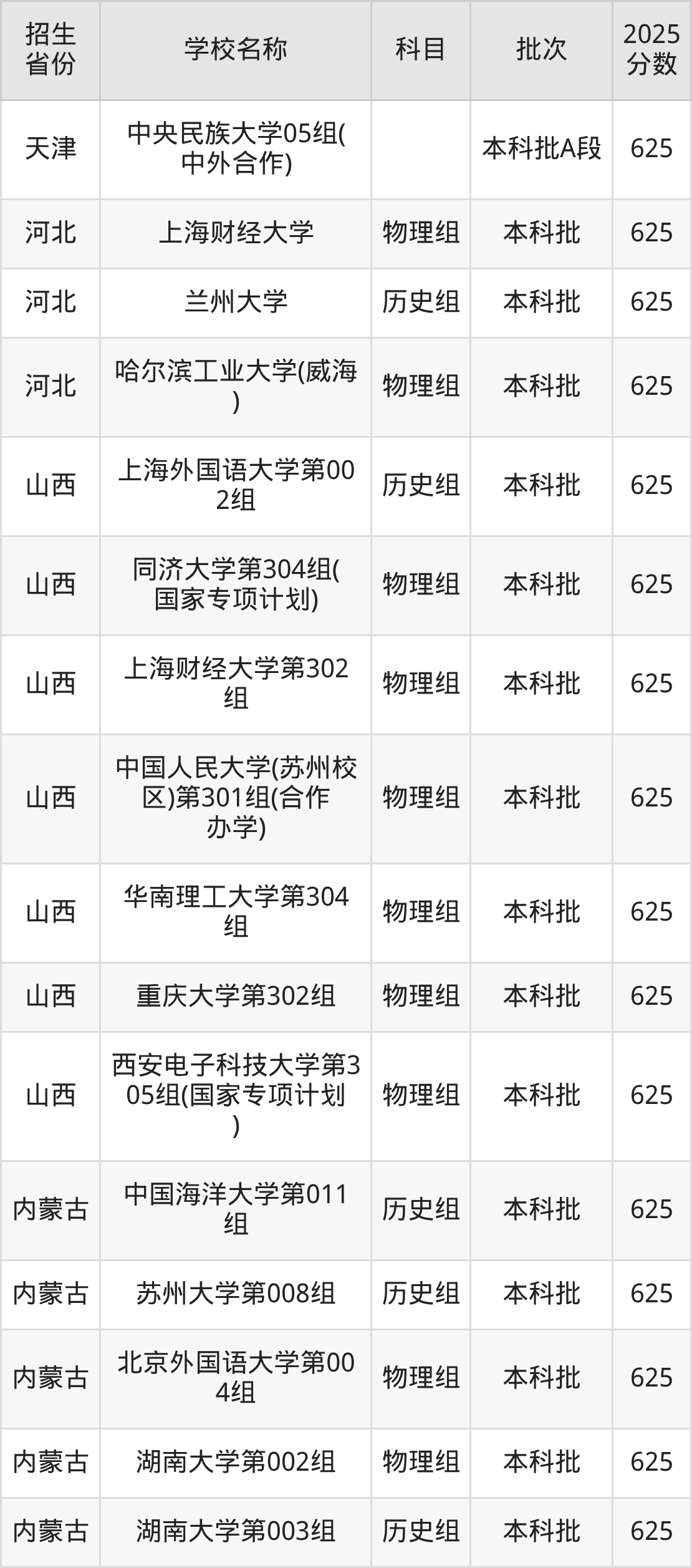 筛选全国各省2025年录取分数线为625分的重点大学如下: