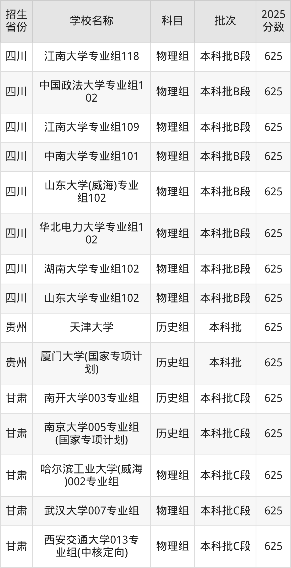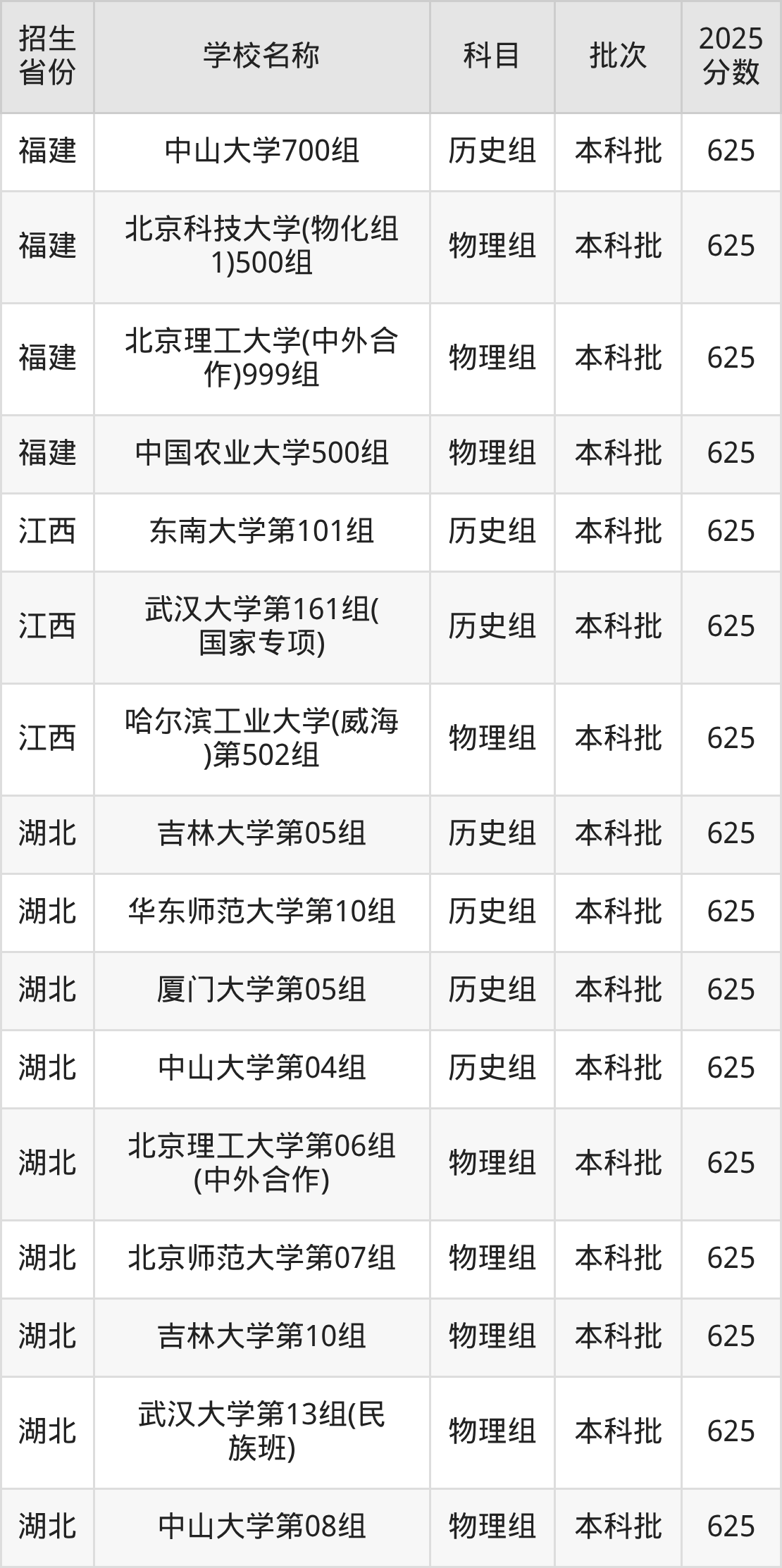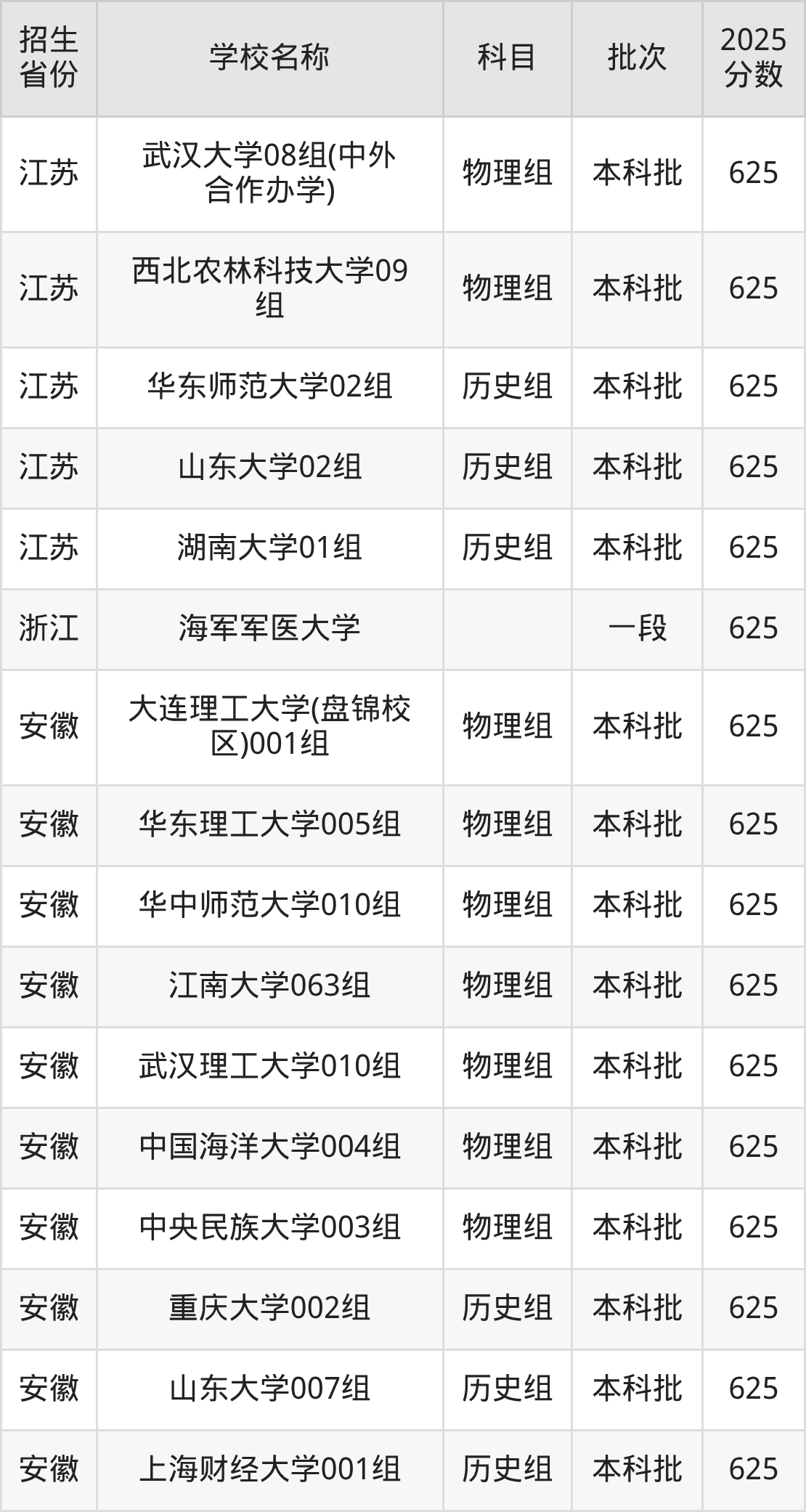 筛选全国各省2025年录取分数线为625分的重点大学如下: