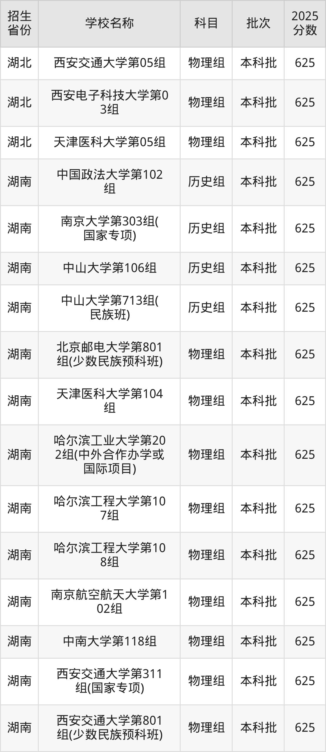 湖南省历史组分数线是625分的重点大学有:中国政法大学、南京大学、中山大学。