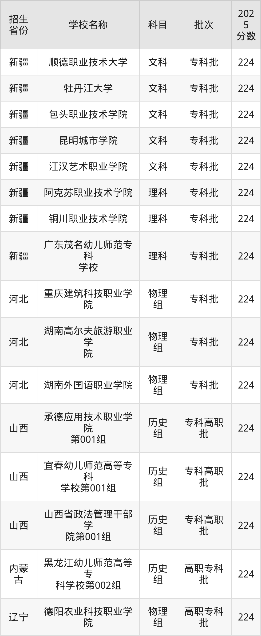 筛选全国各省2025年录取分数线为224分的文科大学如下: