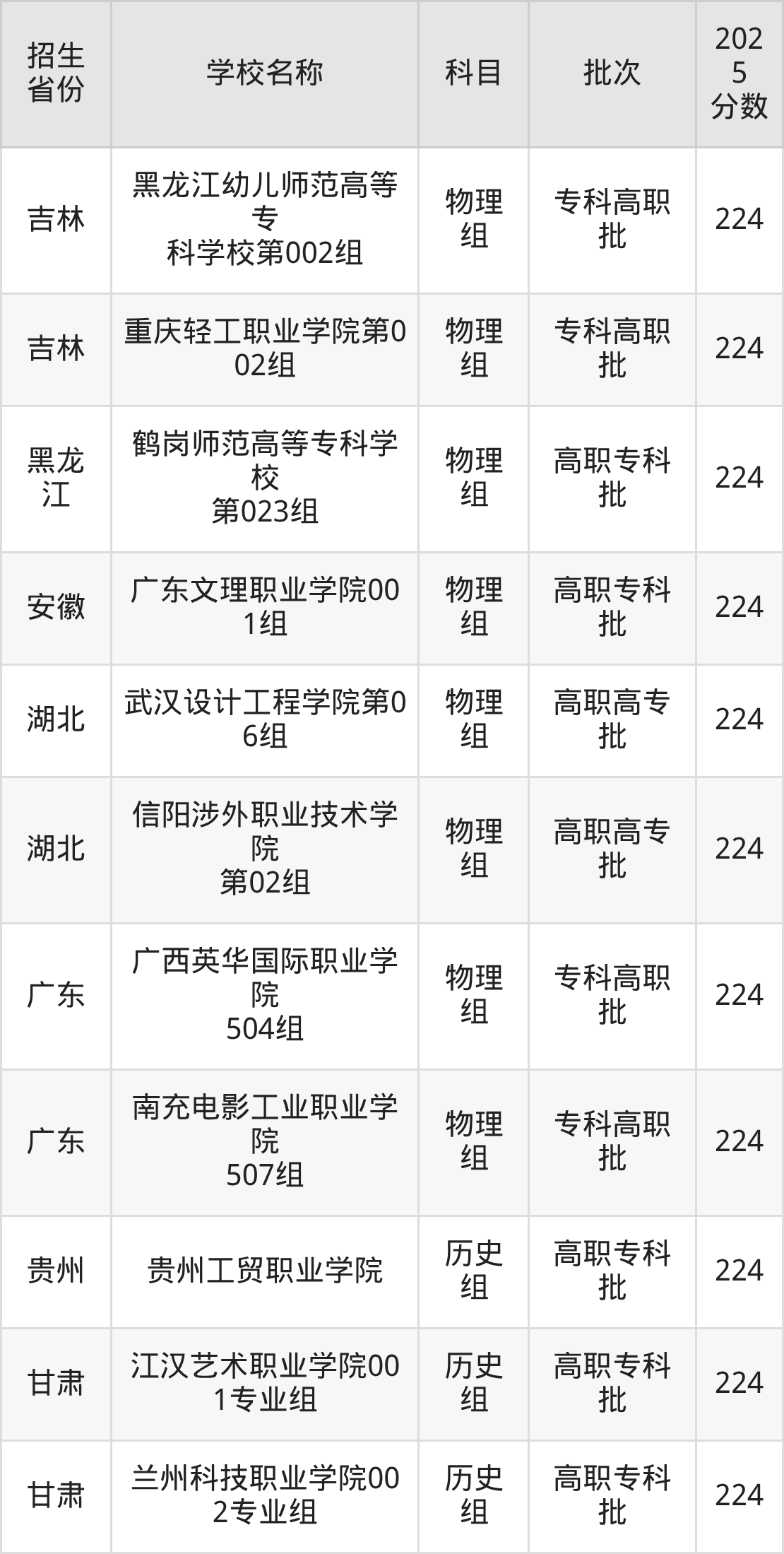 广东省物理组分数线是224分的文科大学有:广西英华国际职业学院、南充电影工业职业学院。