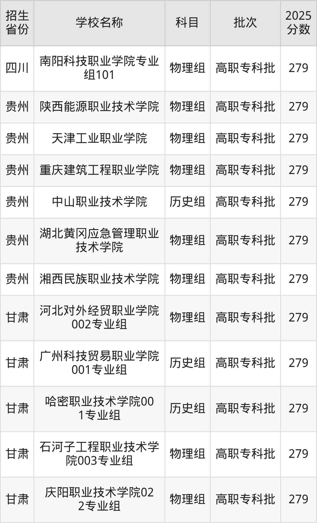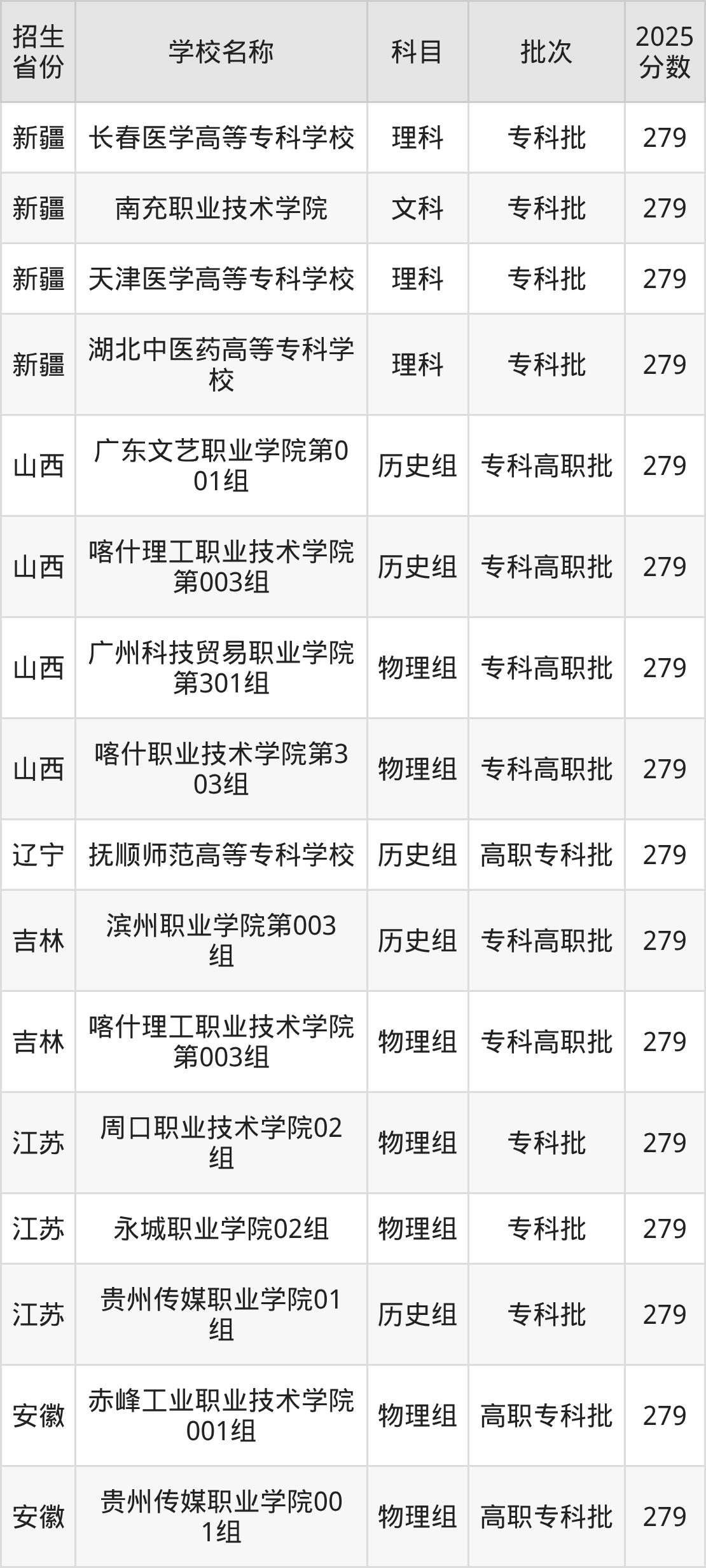 筛选全国各省2025年录取分数线为279分的公办专科大学如下:
