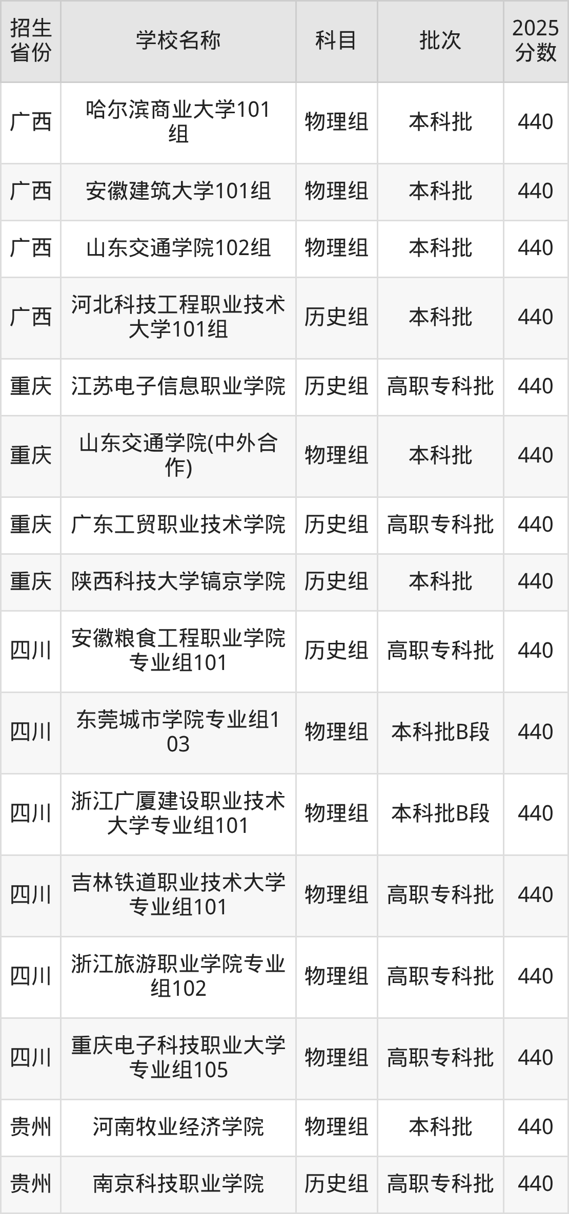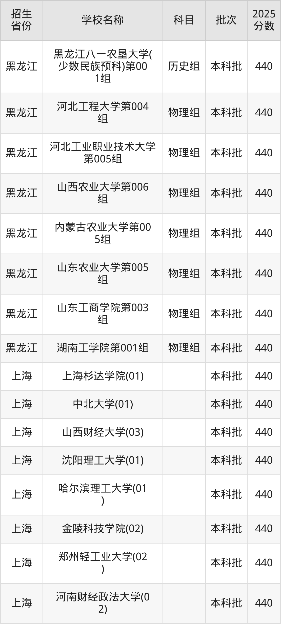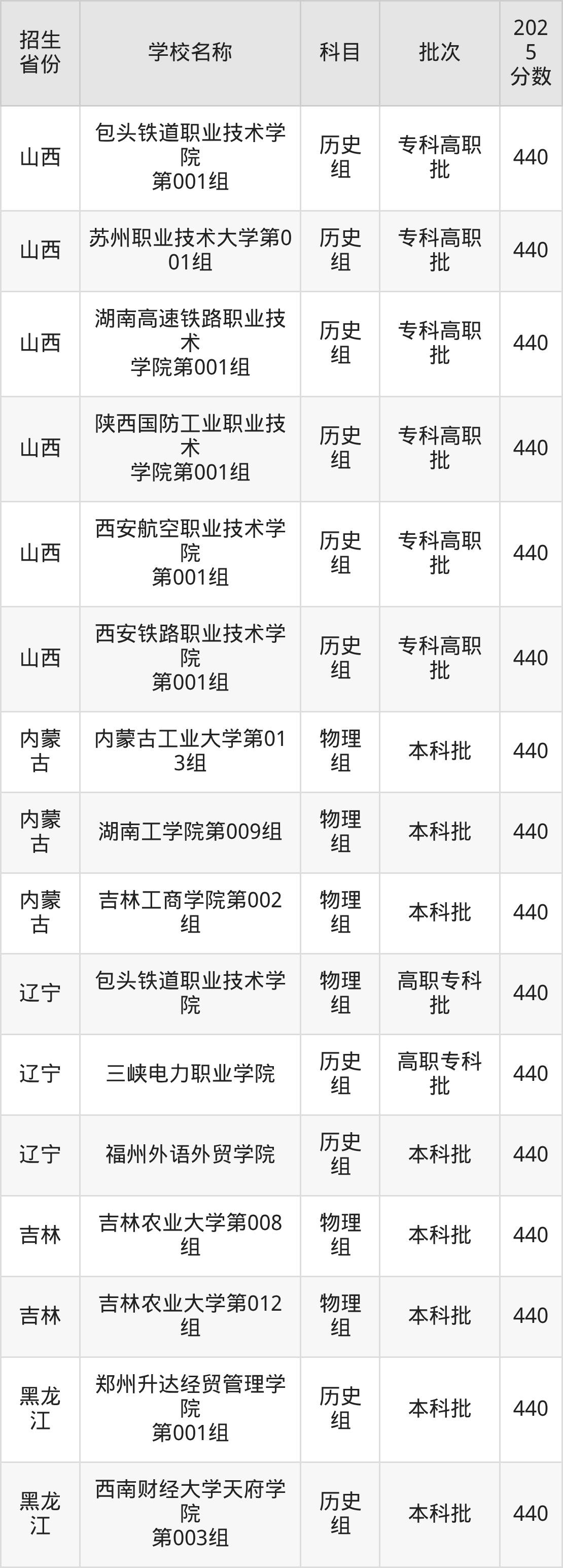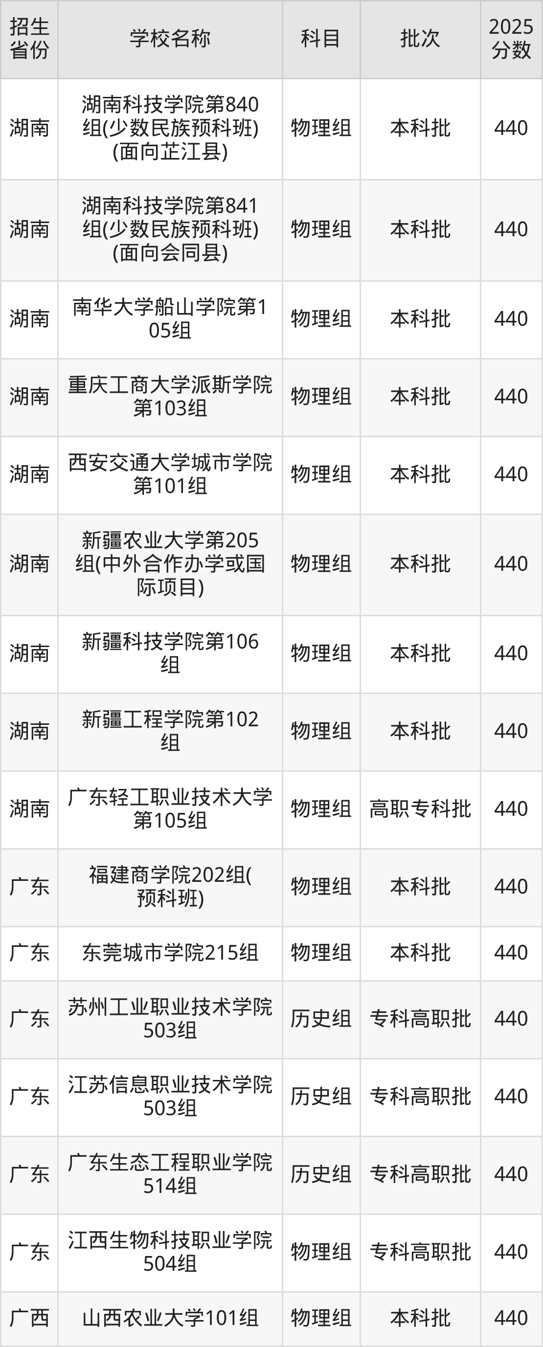 筛选全国各省2025年录取分数线为440分的理科大学如下: