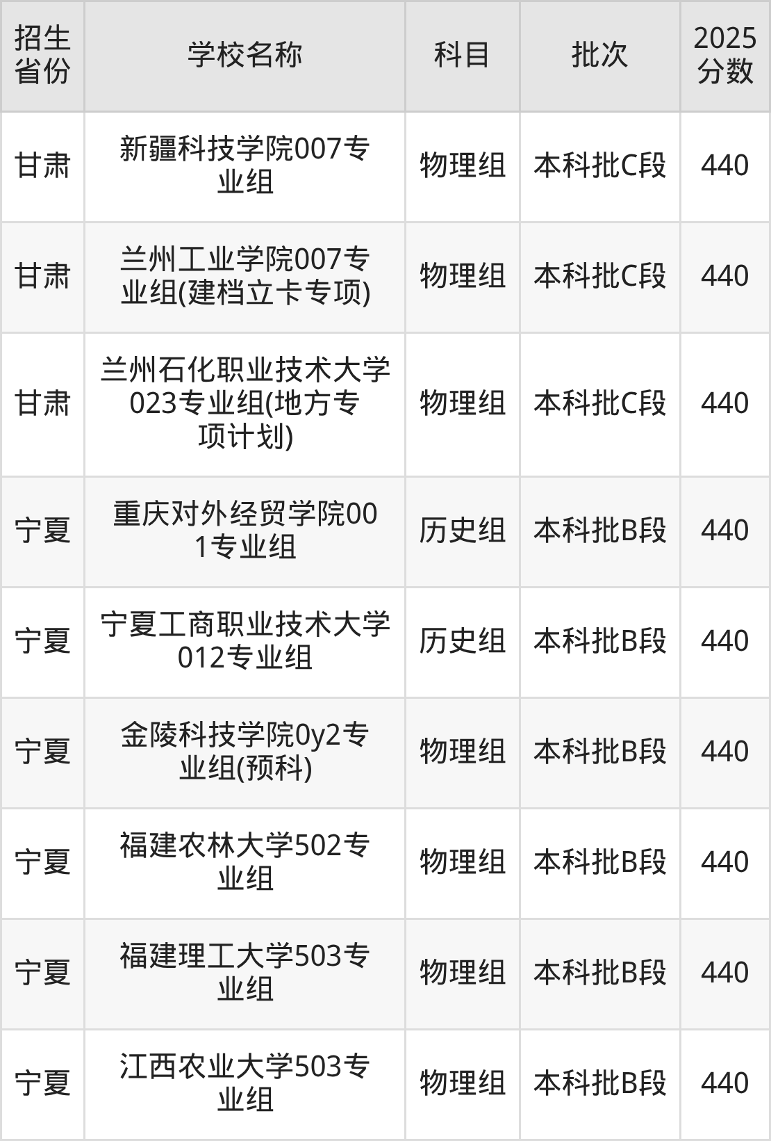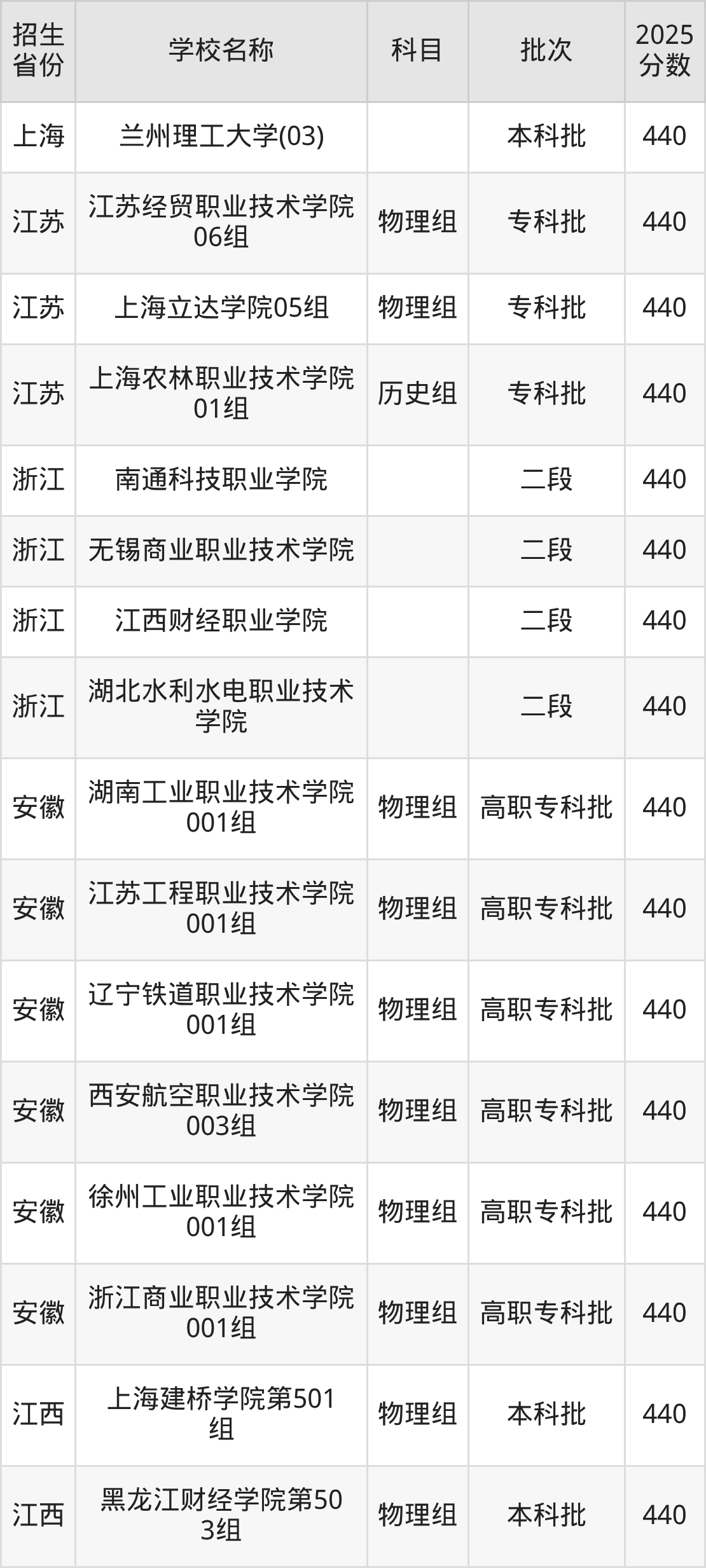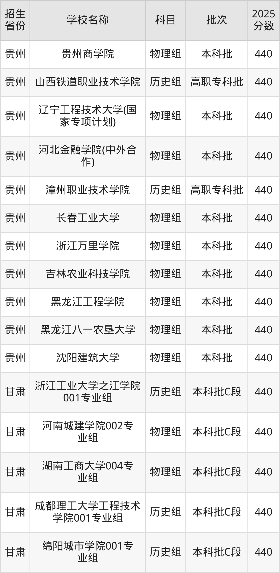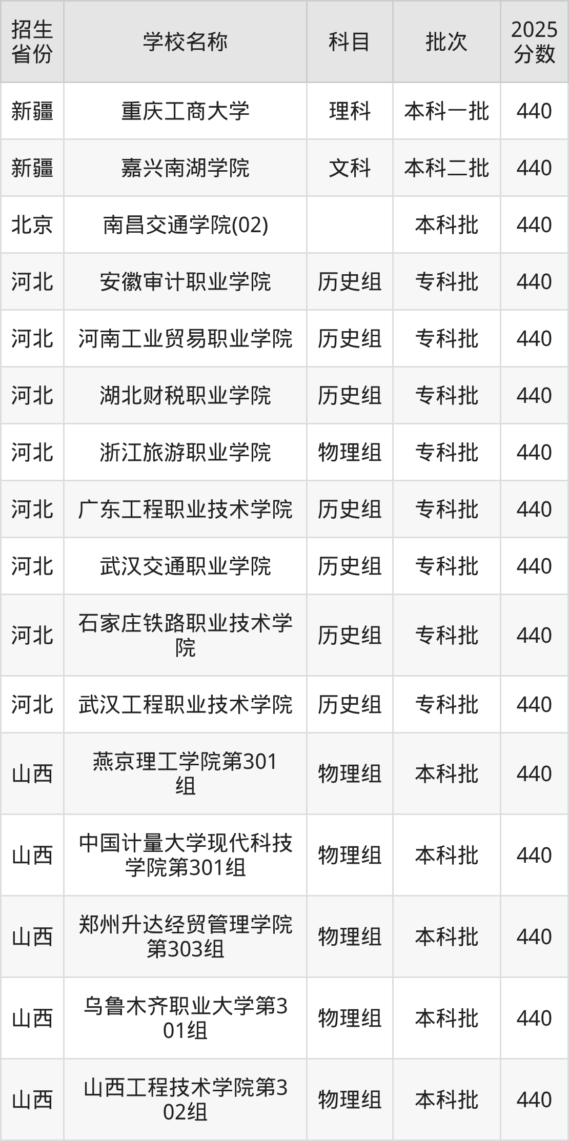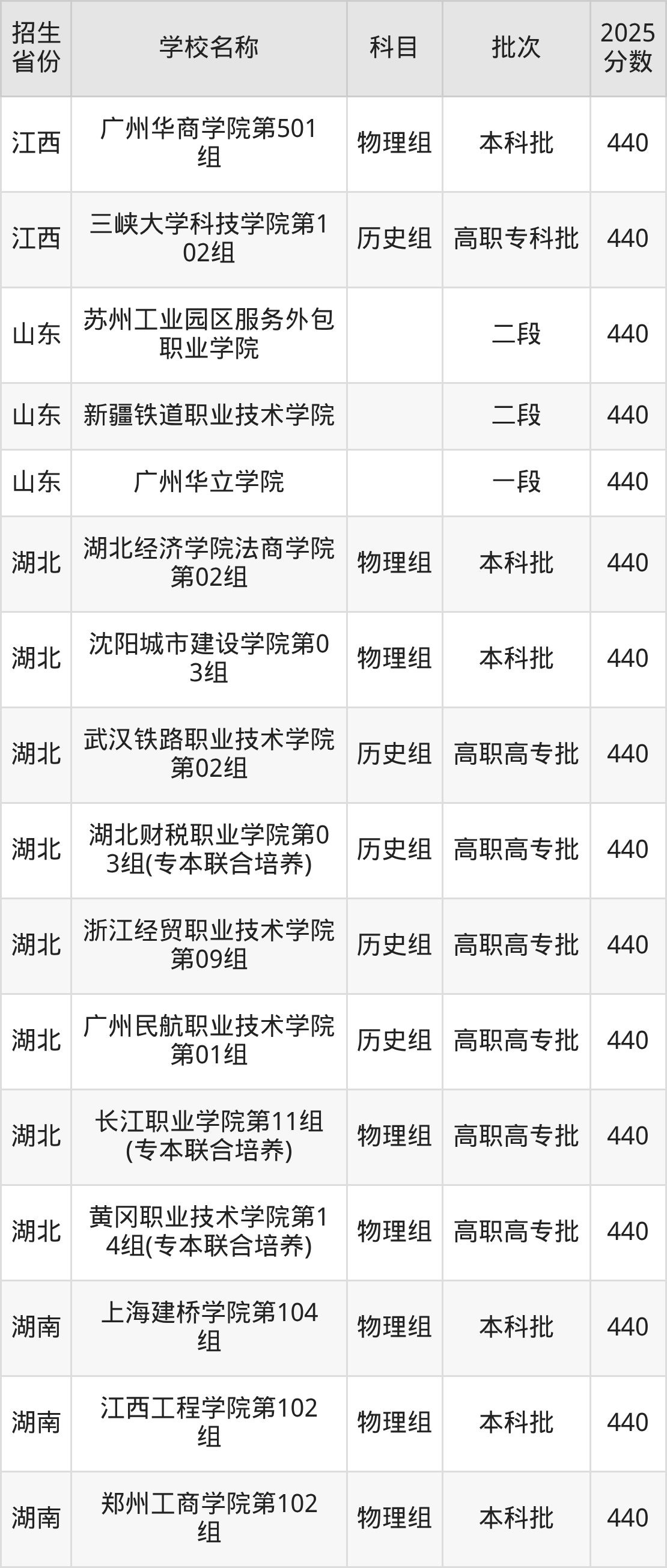 筛选全国各省2025年录取分数线为440分的理科大学如下: