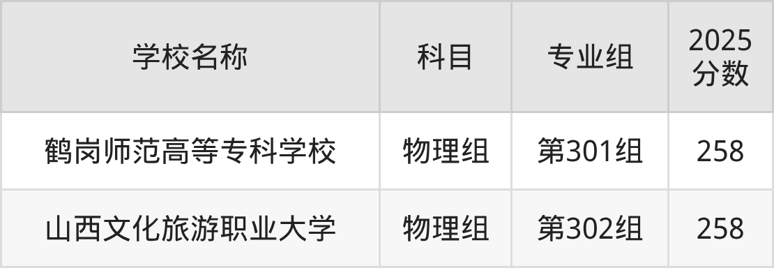 山西高考录取分数线在258分左右的公办院校专业组一共有2个,其中物理组有:鹤岗师范高等专科学校(258分)、山西文化旅游职业大学(258分)。