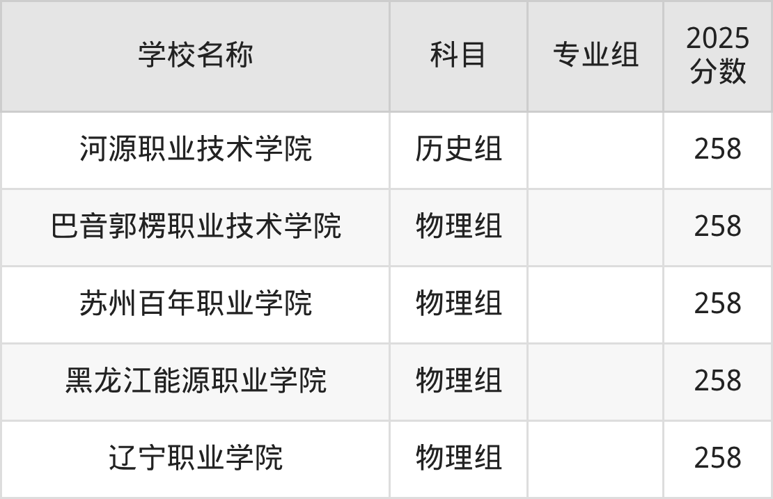 贵州高考录取分数线在258分左右的公办院校专业组一共有5个,其中历史组有:河源职业技术学院(258分),物理组有:巴音郭楞职业技术学院(258分)、苏州百年职业学院(258分)、黑龙江能源职业学院(258分)。