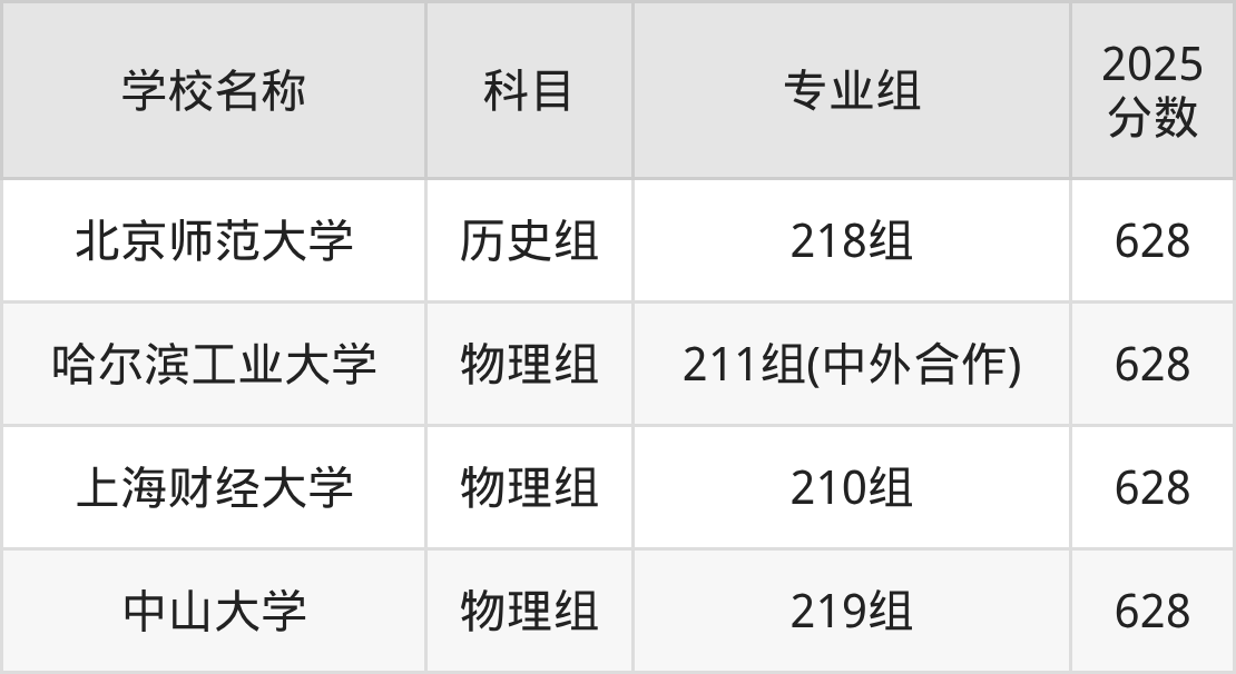 广东高考录取分数线在628分左右的公办院校专业组一共有4个,其中历史组有:北京师范大学(628分),物理组有:哈尔滨工业大学(628分)、上海财经大学(628分)、中山大学(628分)。