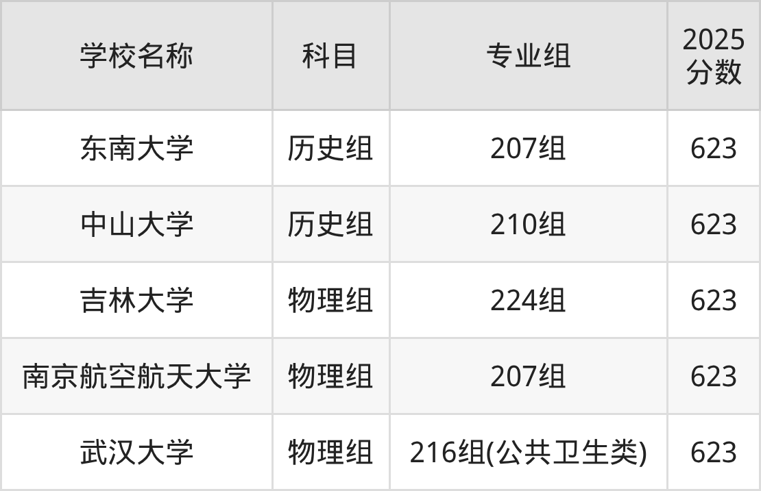 广东高考录取分数线在623分左右的公办院校专业组一共有5个,其中历史组有:东南大学(623分)、中山大学(623分),物理组有:吉林大学(623分)、南京航空航天大学(623分)、武汉大学(623分)。