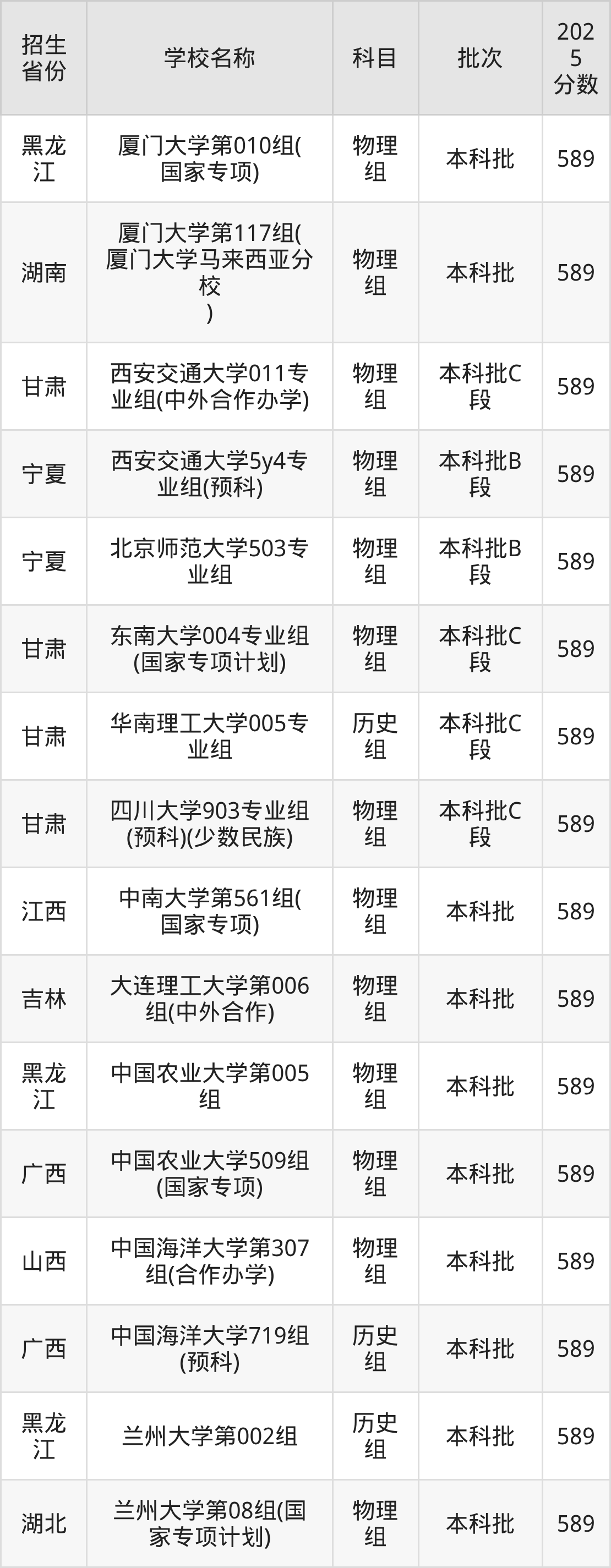 筛选全国各省2025年录取分数线为589分的985大学如下: