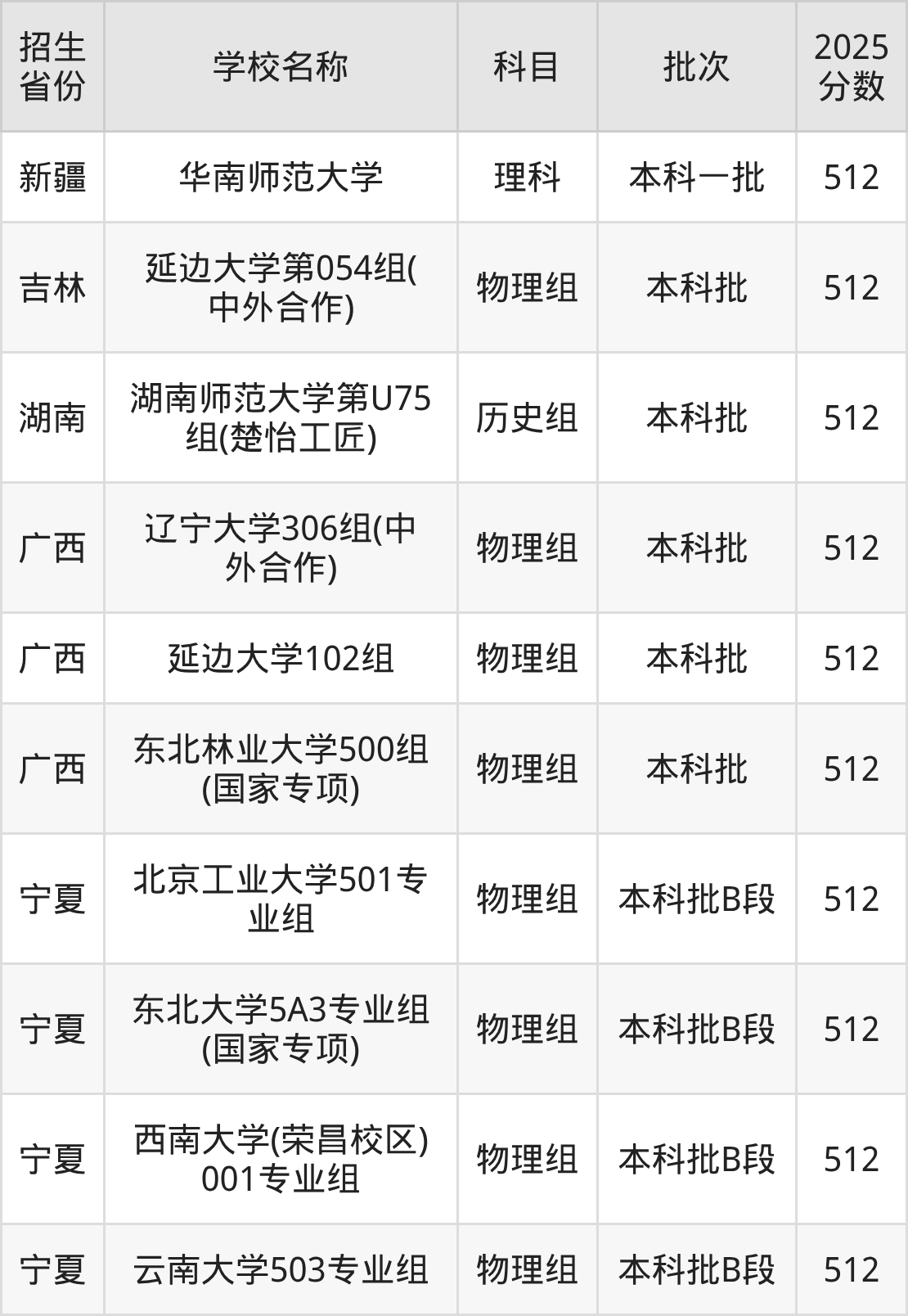 512分可以上的大学有华南师范大学、延边大学、湖南师范大学、辽宁大学等211大学。本文整理了宁夏、广西等全国512分左右的211大学名单,请2026年高考生参考。
