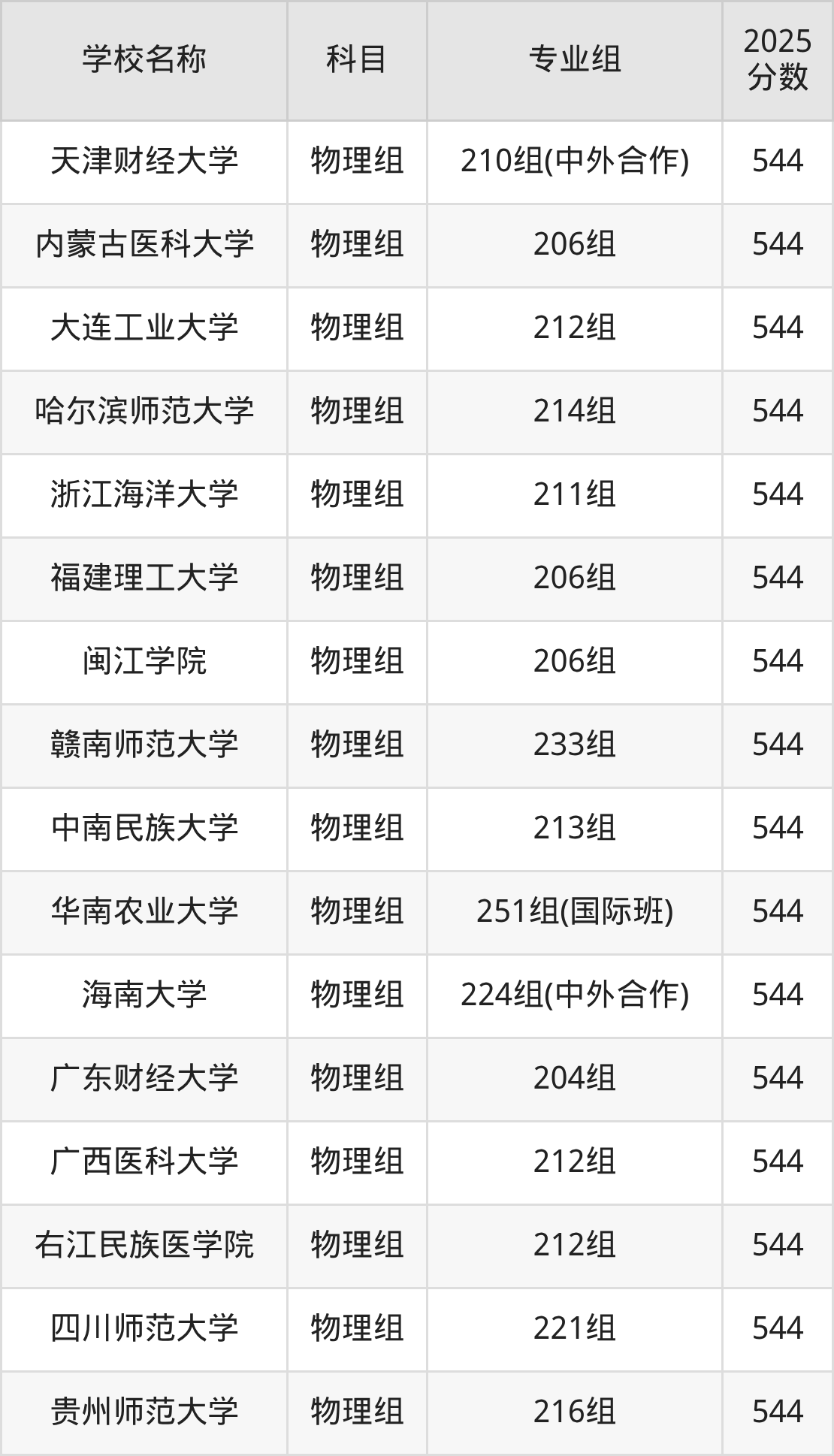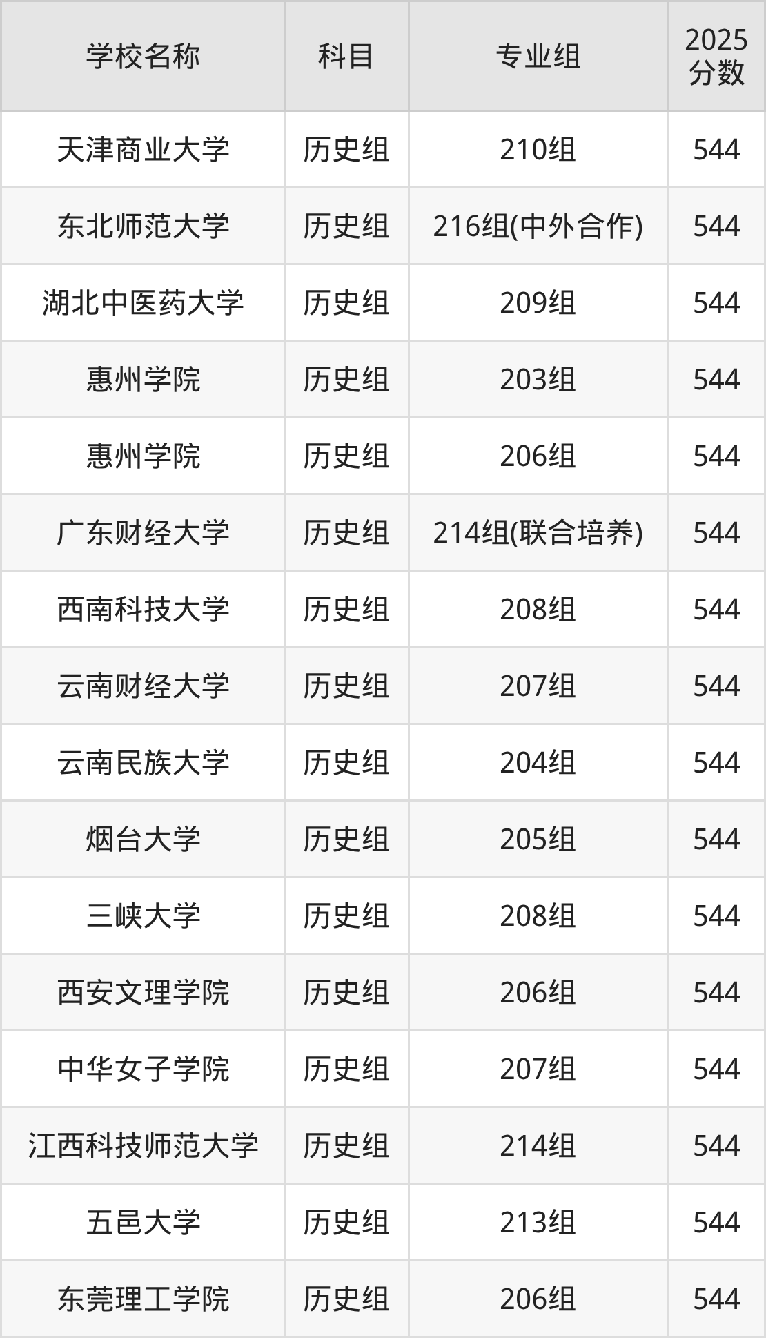 广东高考录取分数线在544分左右的公办院校专业组一共有40个,其中历史组有:天津商业大学(544分)、东北师范大学(544分)、湖北中医药大学(544分),物理组有:天津财经大学(544分)、内蒙古医科大学(544分)、大连工业大学(544分)。