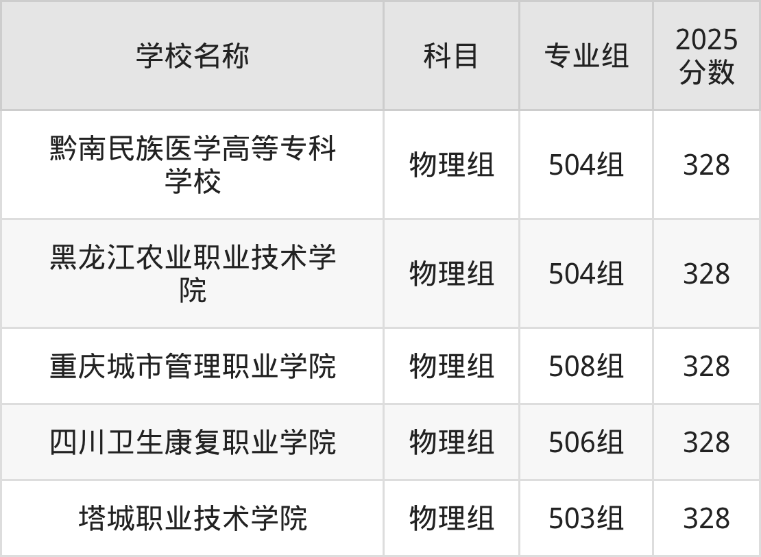 广东高考录取分数线在328分左右的公办院校专业组一共有5个,其中物理组有:黔南民族医学高等专科学校(328分)、黑龙江农业职业技术学院(328分)、重庆城市管理职业学院(328分)。
