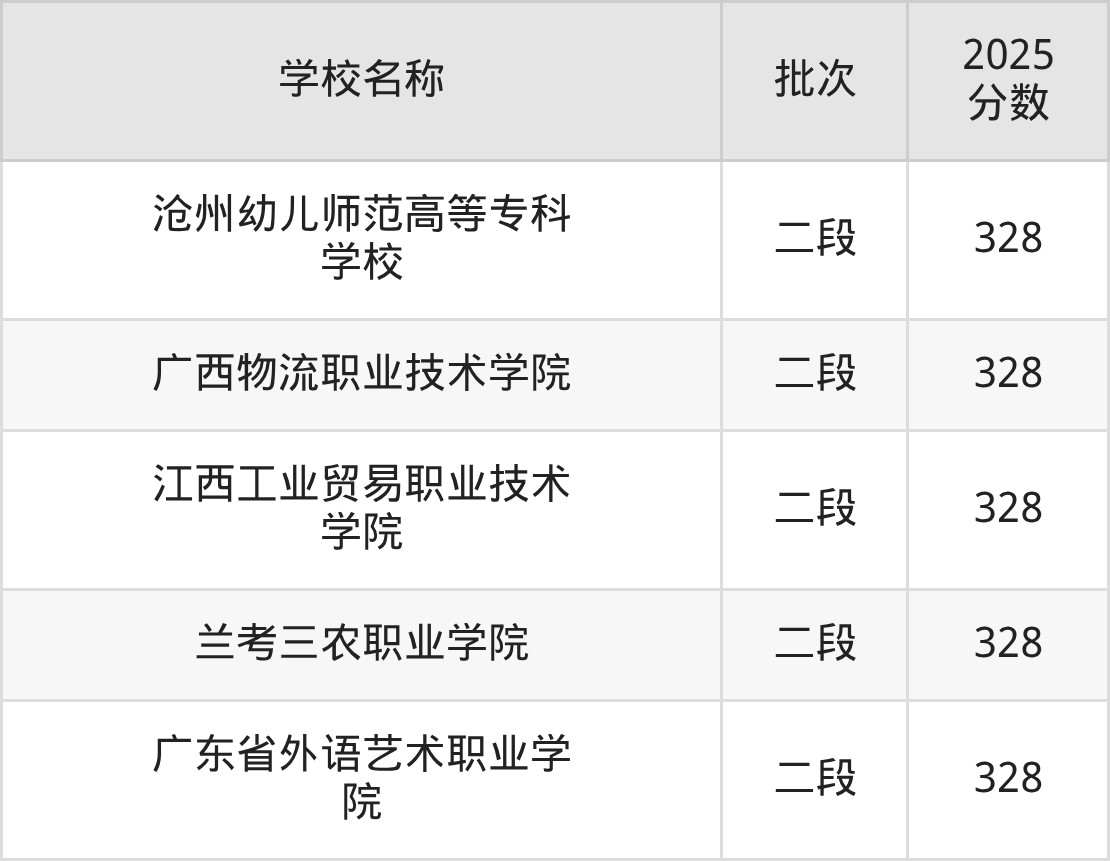 山东高考录取分数线在328分左右的公办大学一共有5所。分别是沧州幼儿师范高等专科学校(328分)、广西物流职业技术学院(328分)、江西工业贸易职业技术学院(328分)