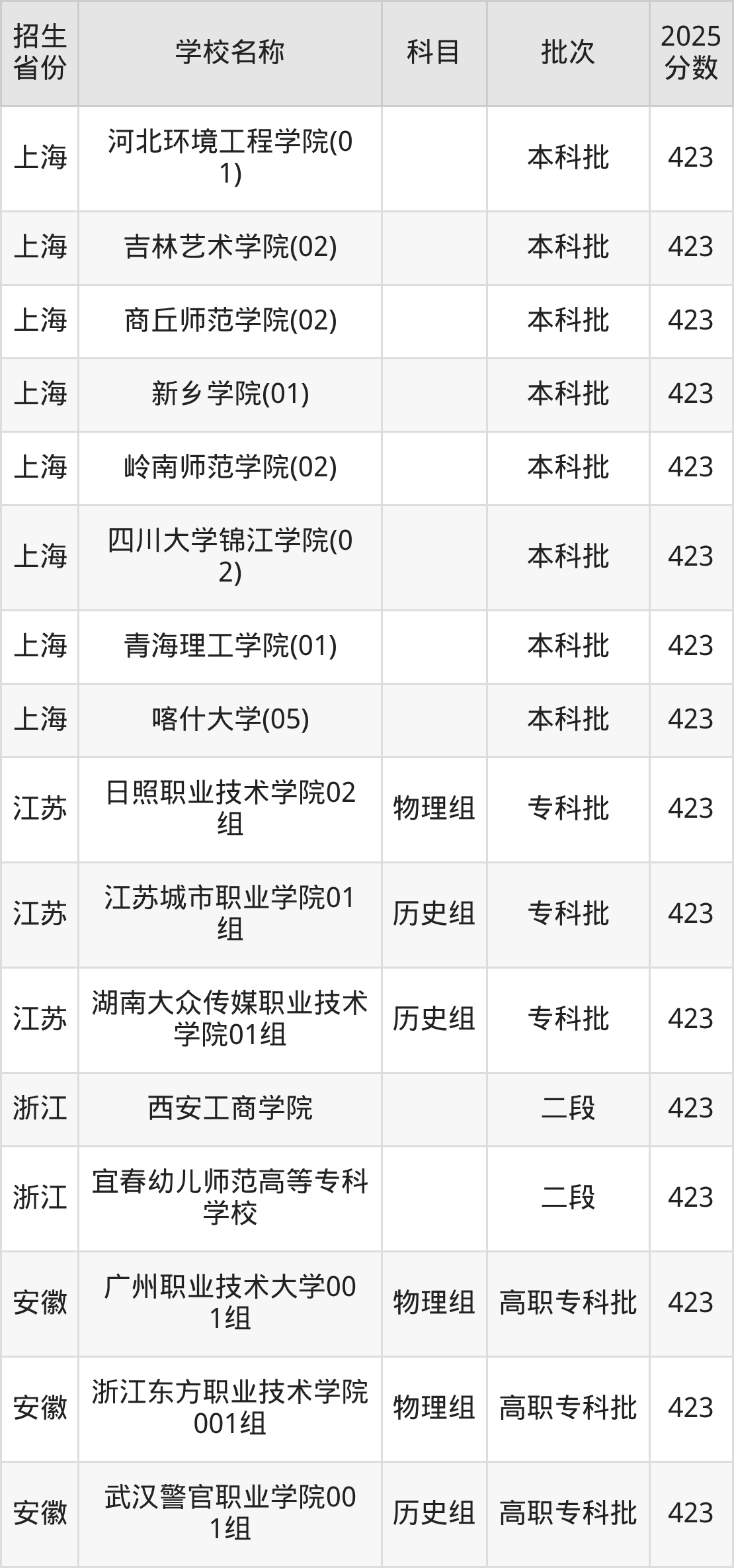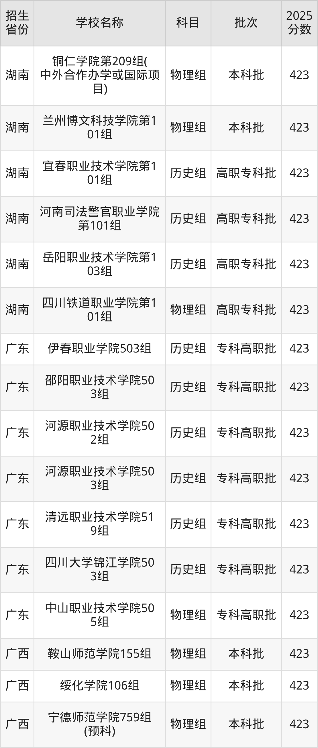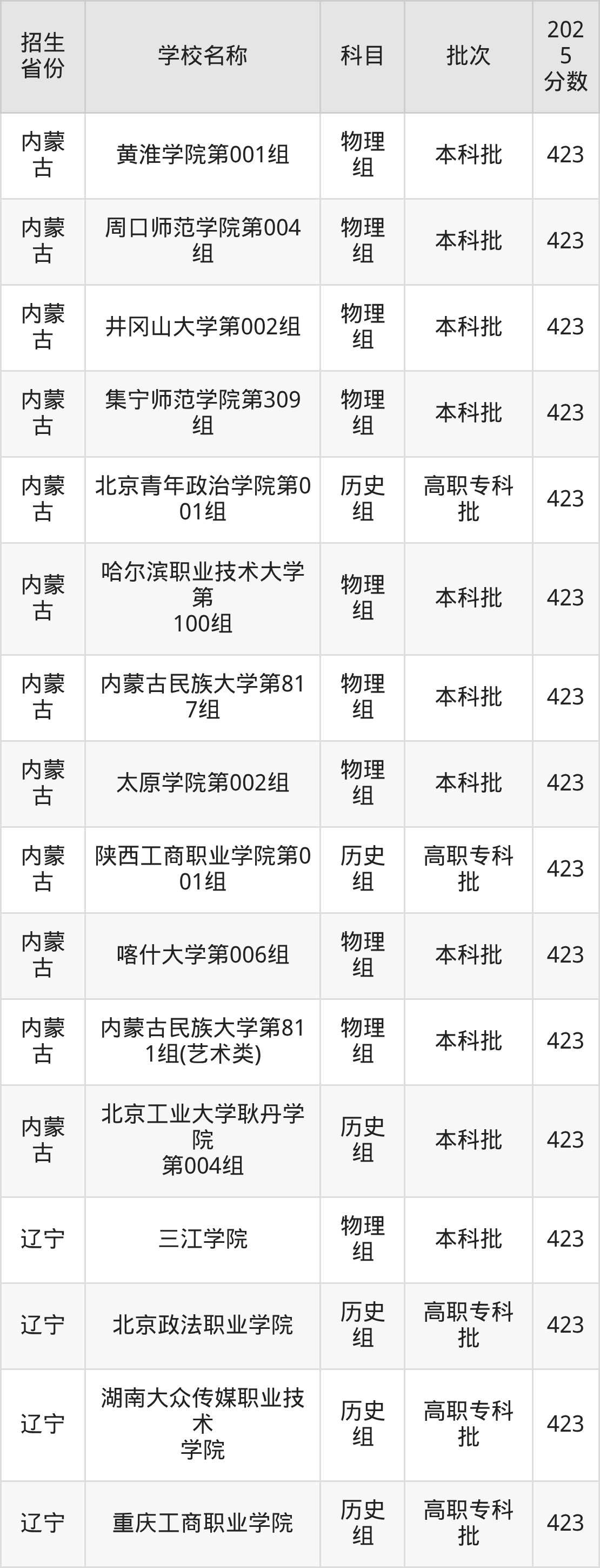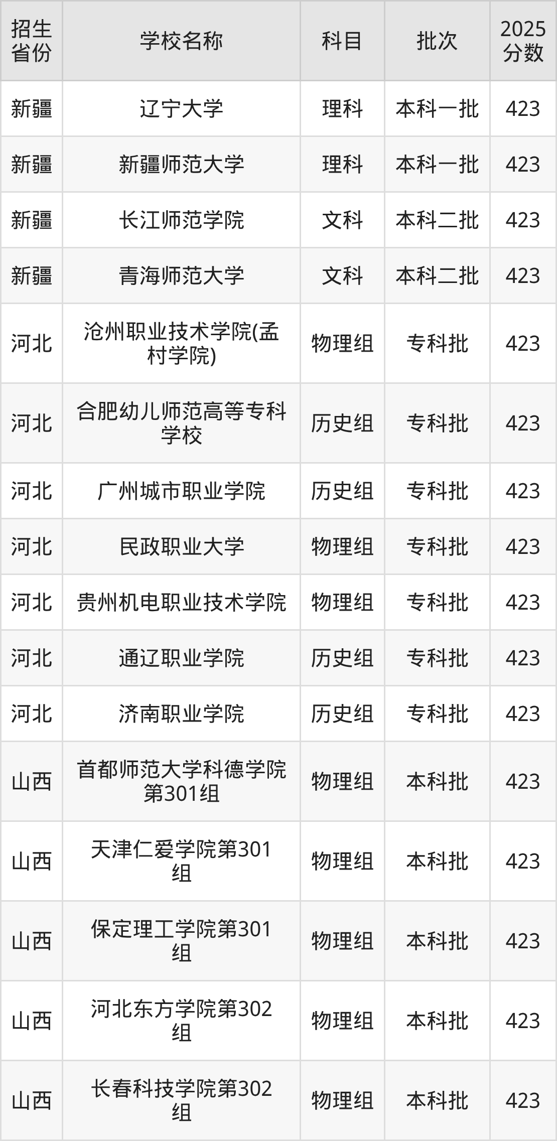 筛选全国各省2025年录取分数线为423分的文科大学如下: