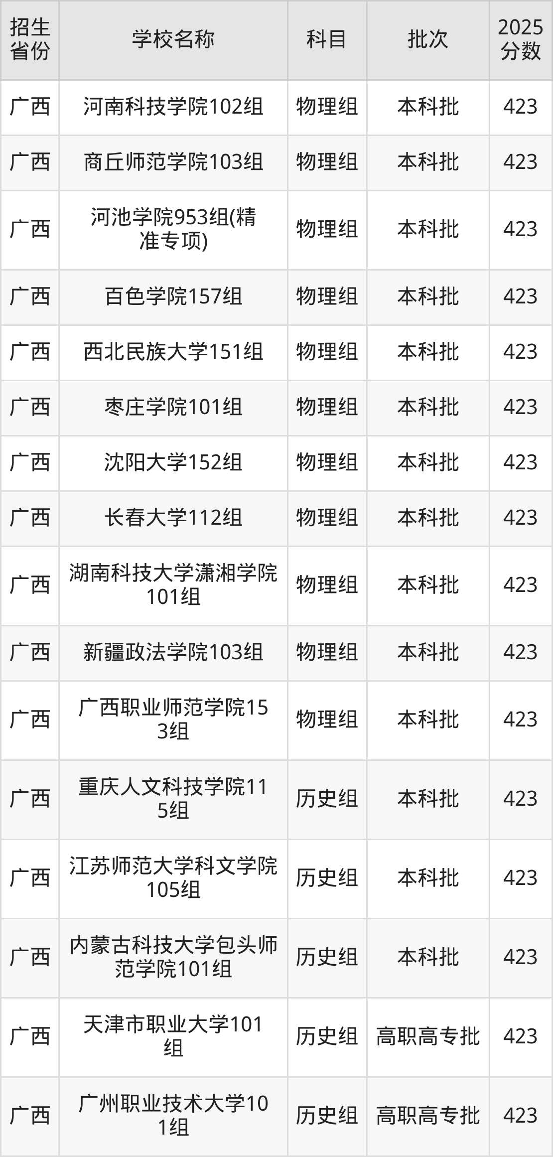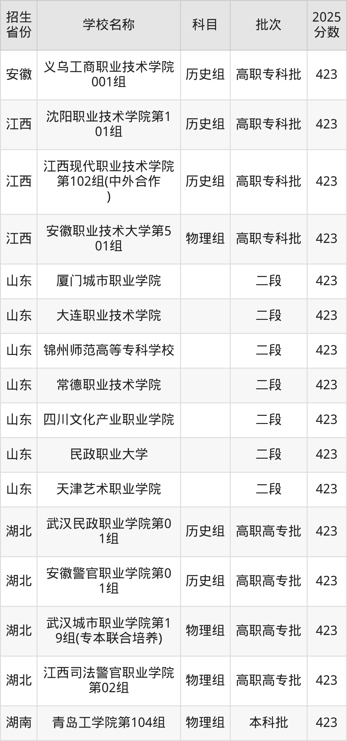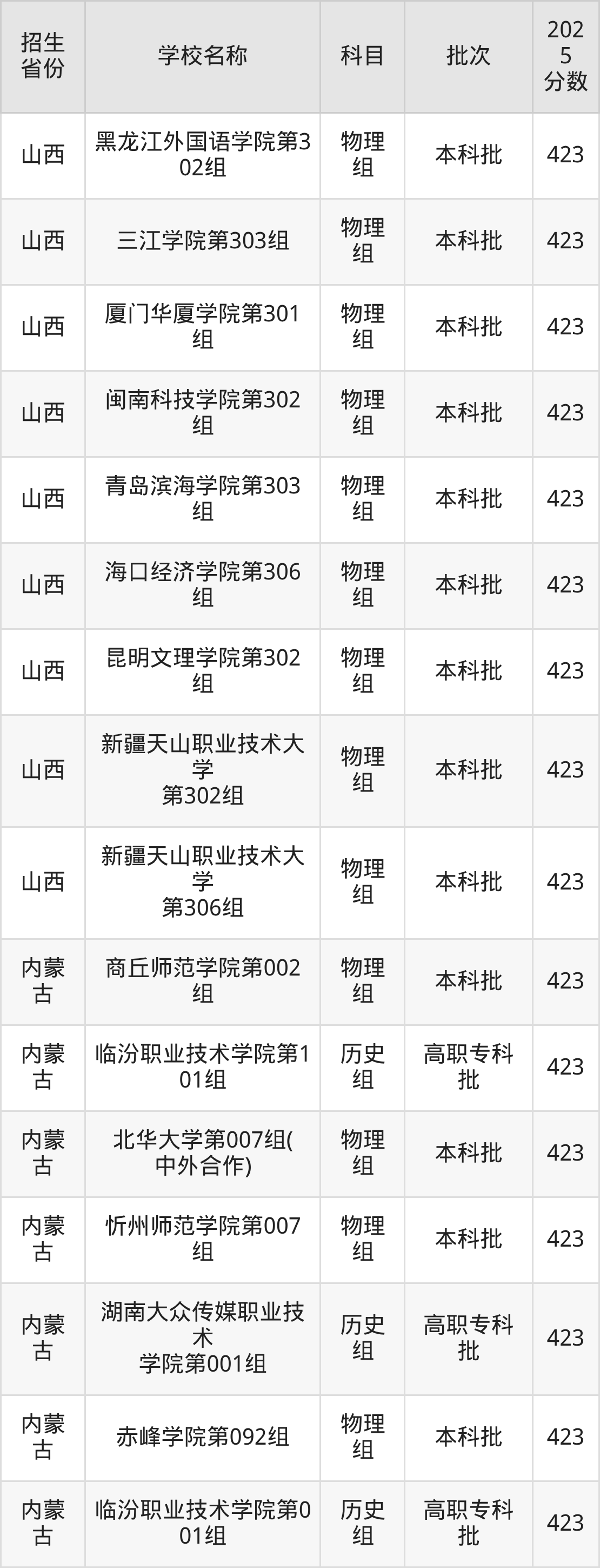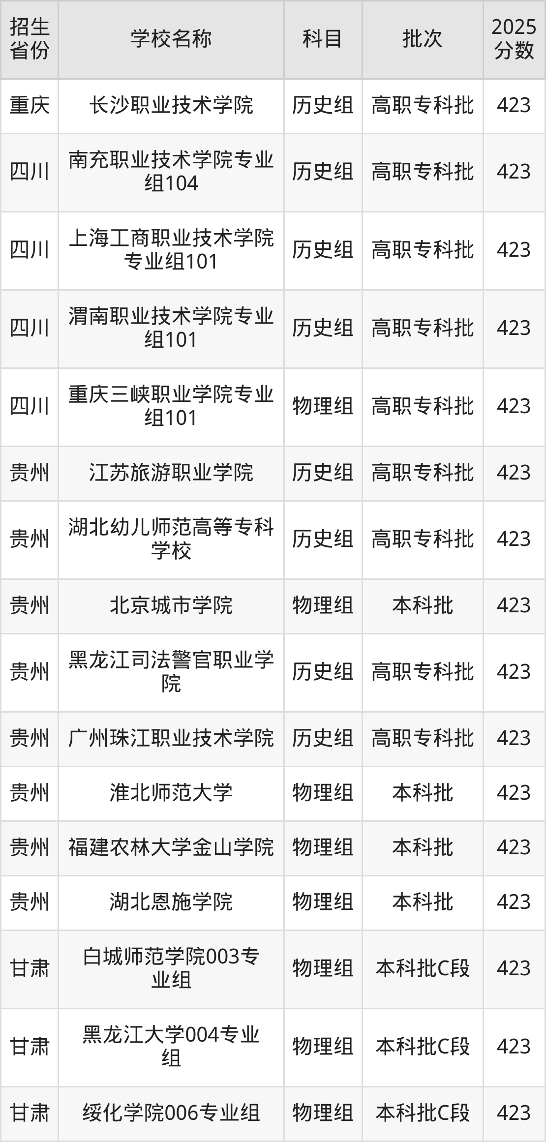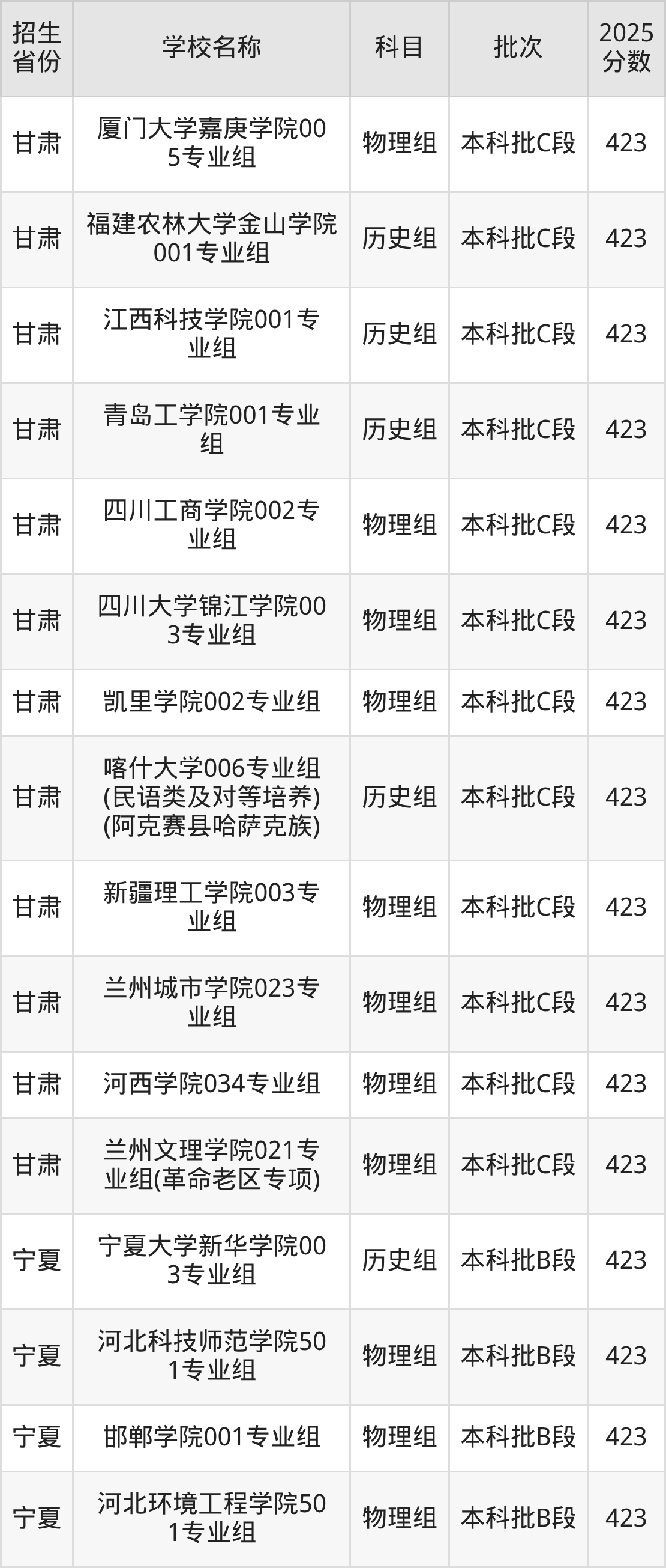 筛选全国各省2025年录取分数线为423分的文科大学如下: