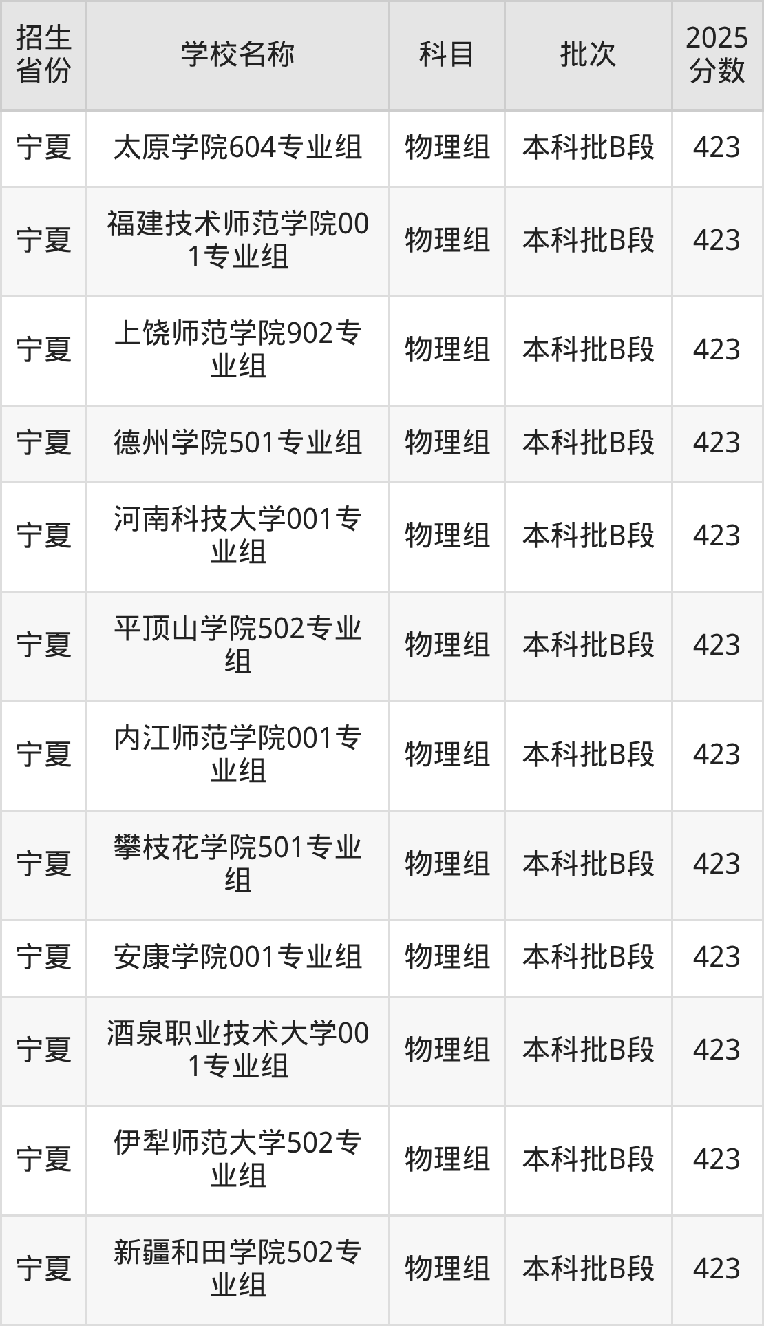 宁夏回族自治区物理组分数线是423分的文科大学有:河北科技师范学院、邯郸学院、河北环境工程学院、太原学院、福建技术师范学院、上饶师范学院、德州学院、河南科技大学、平顶山学院、内江师范学院。
