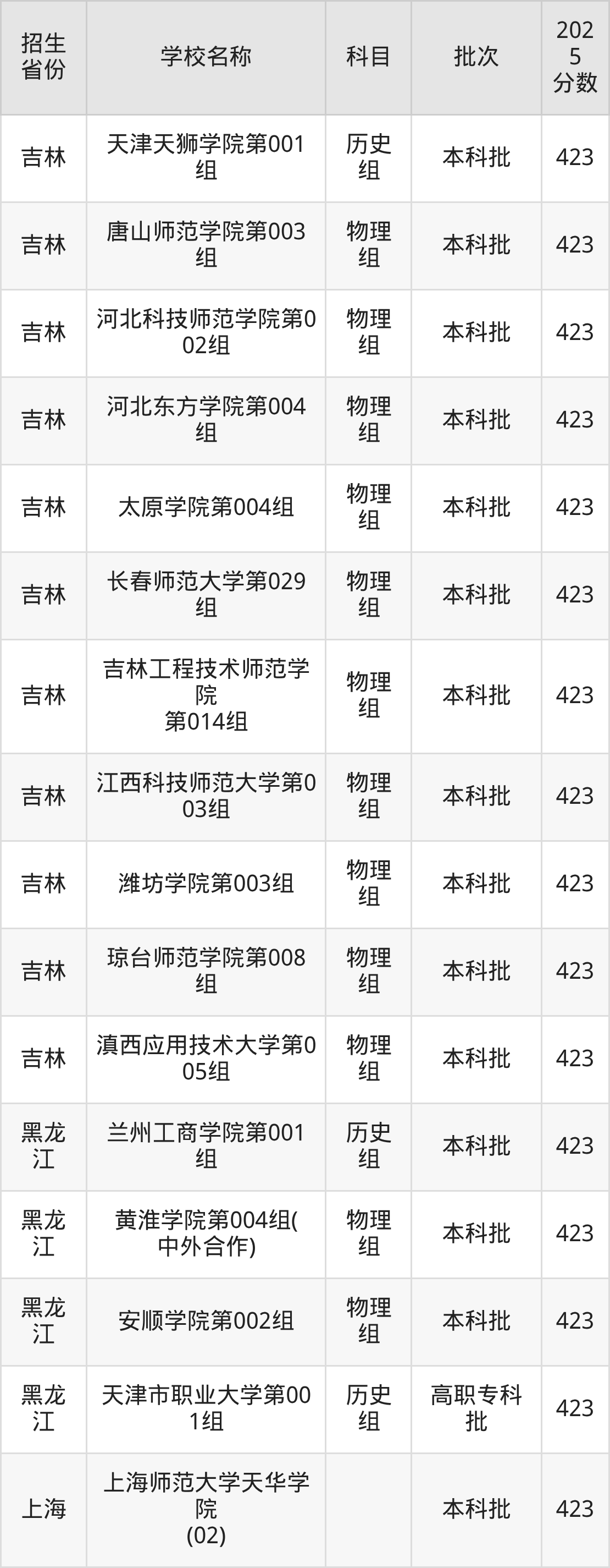 吉林省历史组分数线是423分的文科大学有:天津天狮学院。