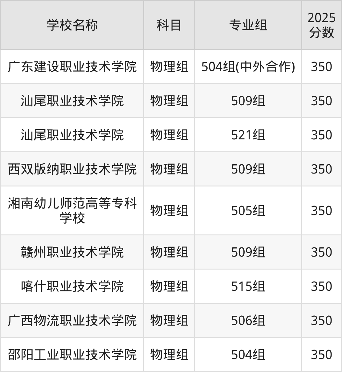 广东高考录取分数线在350分左右的公办院校专业组一共有9个,其中物理组有:广东建设职业技术学院(350分)、汕尾职业技术学院(350分)、西双版纳职业技术学院(350分)。