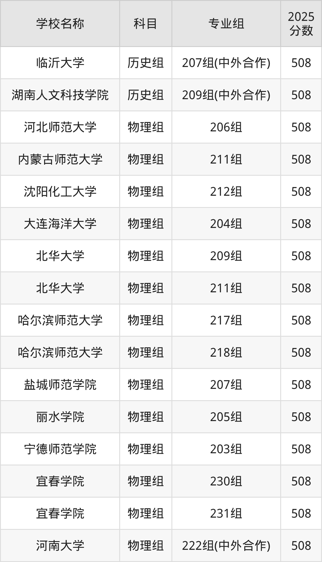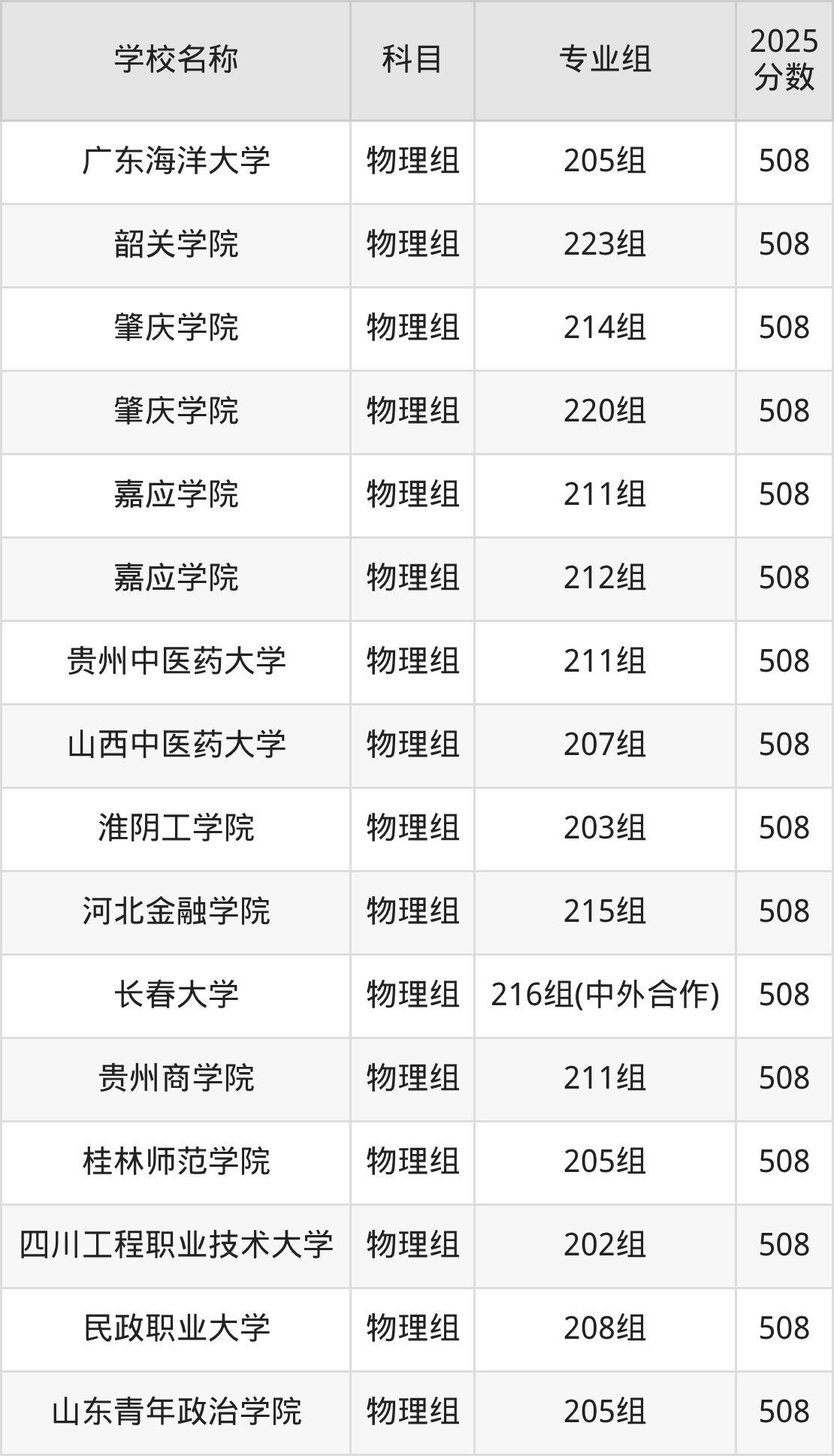 广东高考录取分数线在508分左右的公办院校专业组一共有34个,其中历史组有:临沂大学(508分)、湖南人文科技学院(508分),物理组有:河北师范大学(508分)、内蒙古师范大学(508分)、沈阳化工大学(508分)。