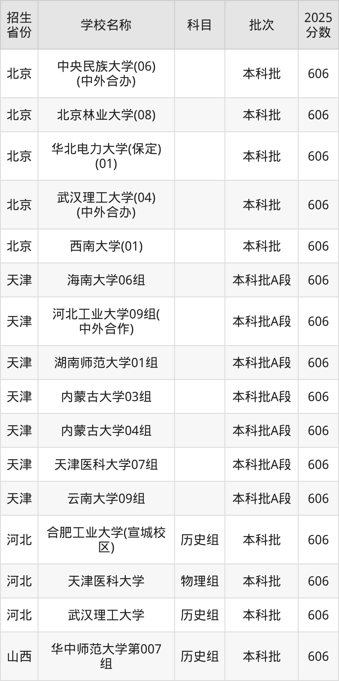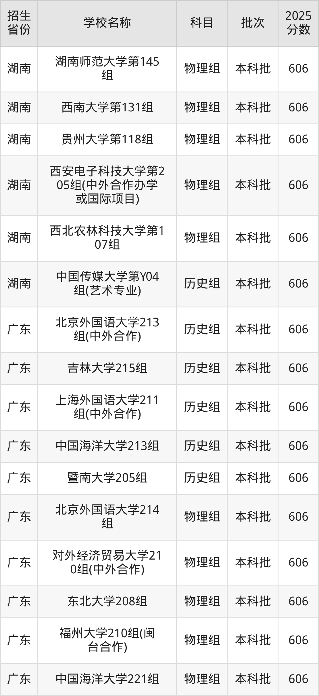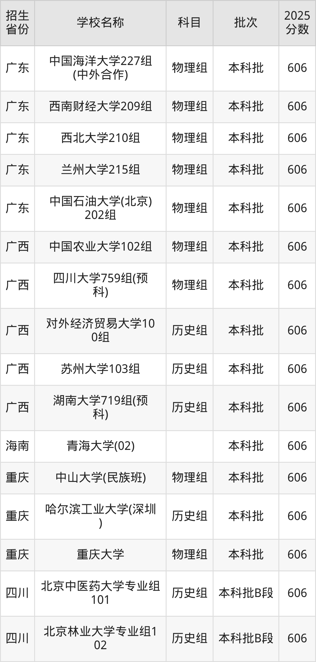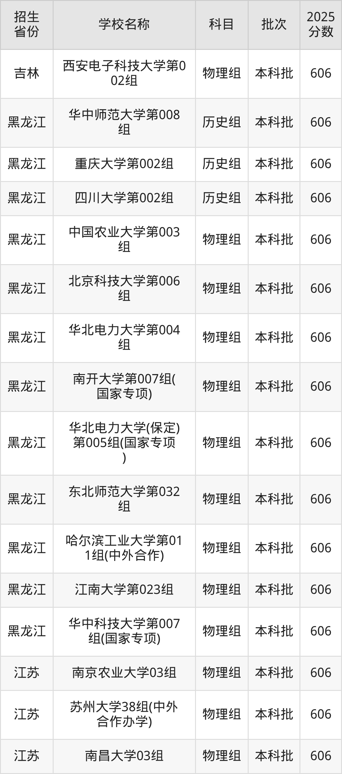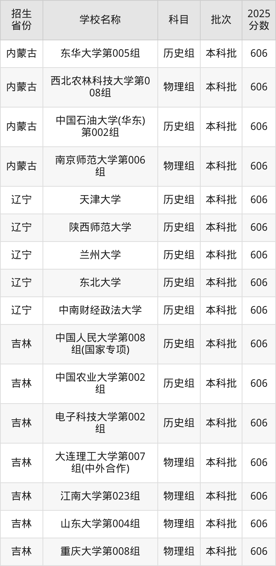 筛选全国各省2025年录取分数线为606分的211大学如下: