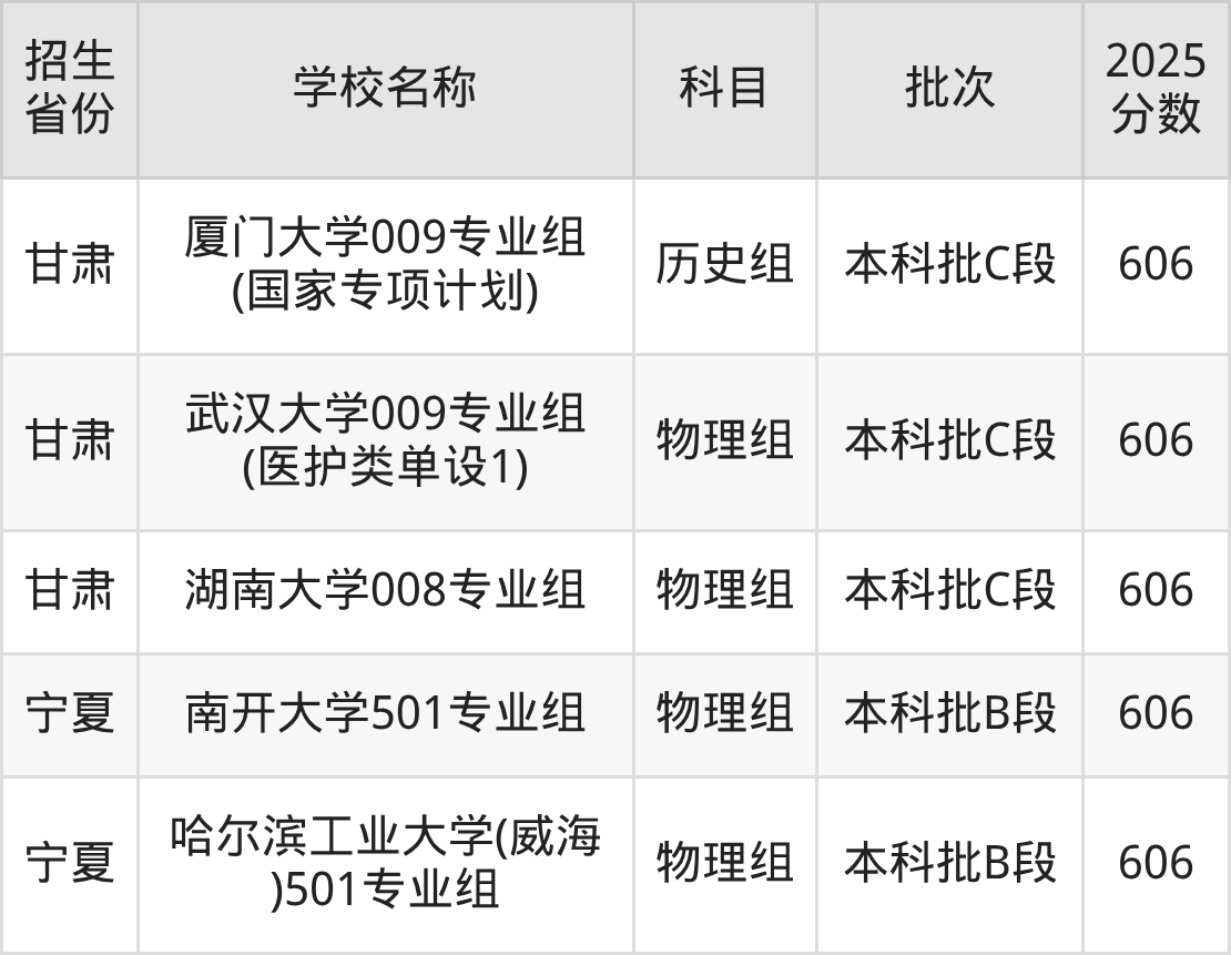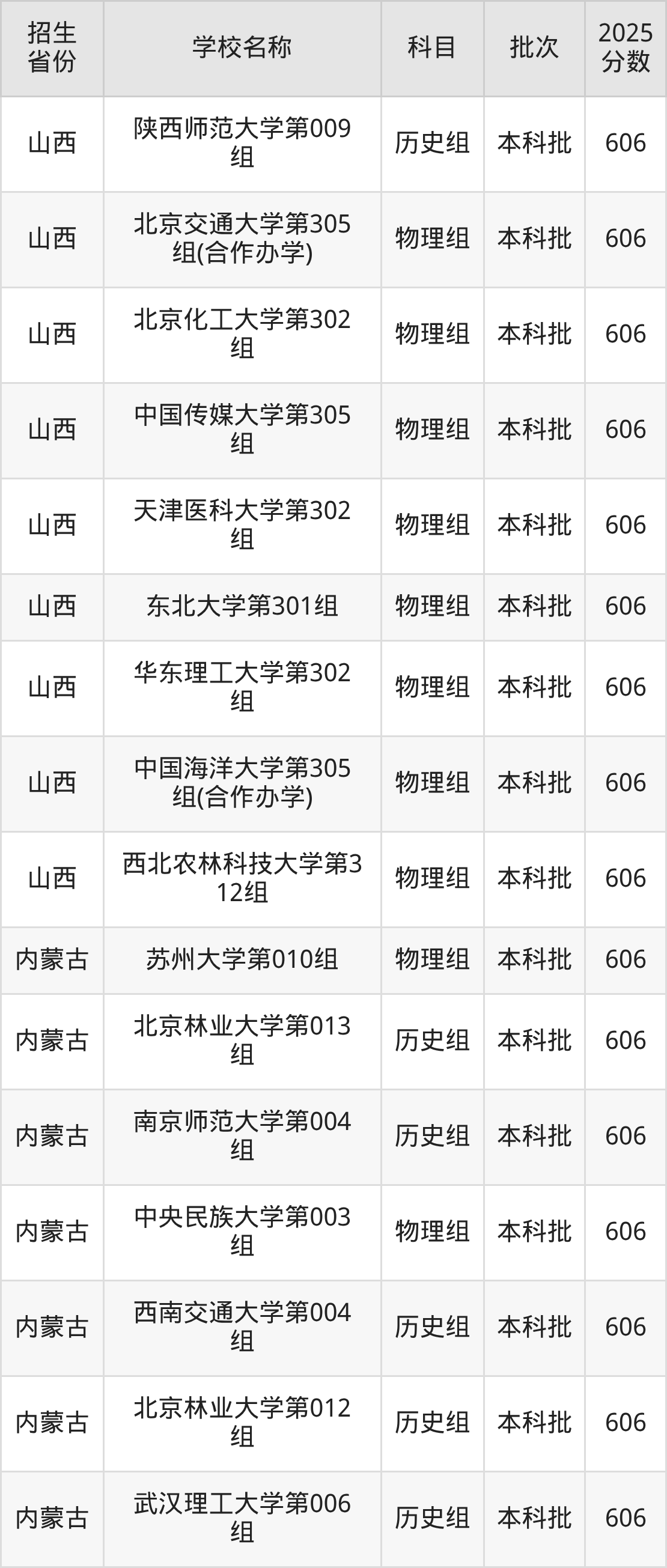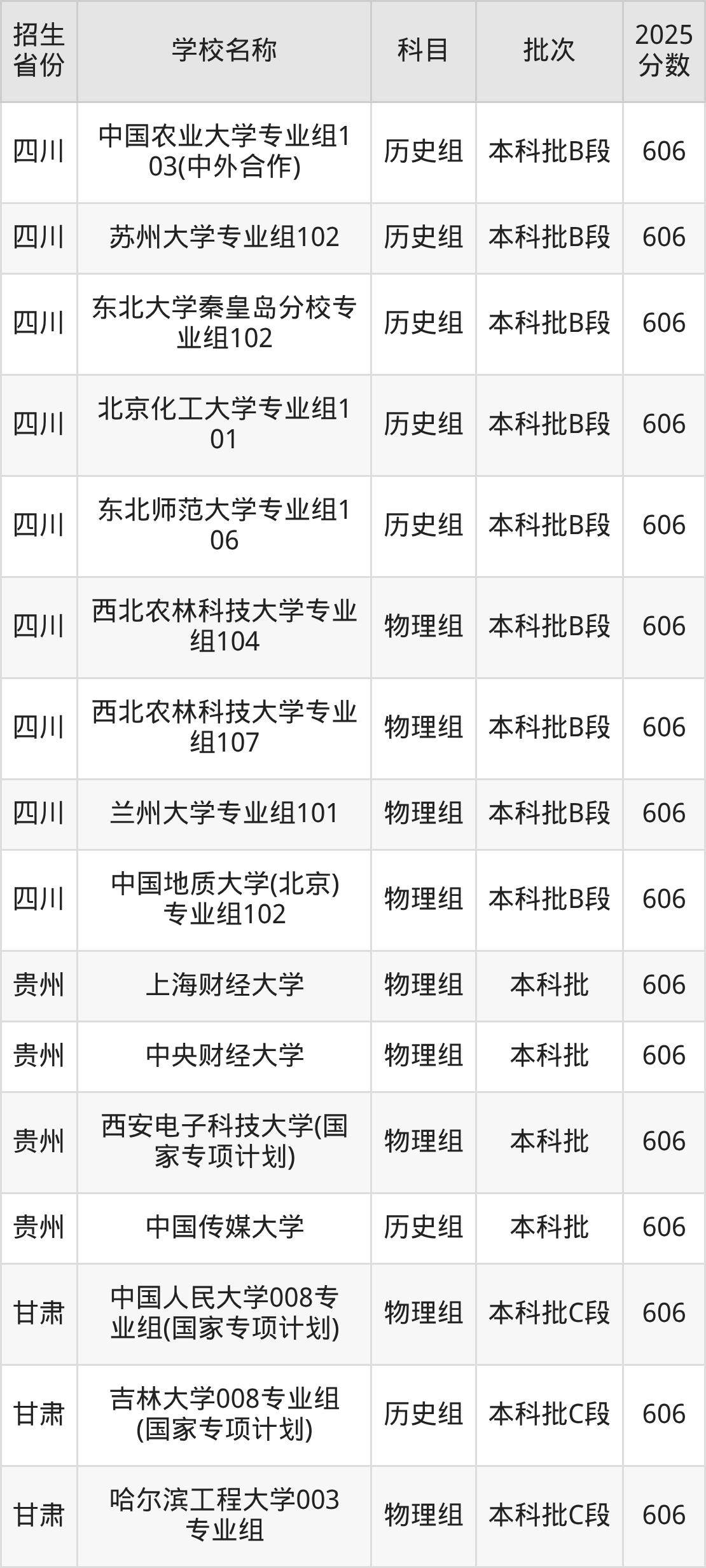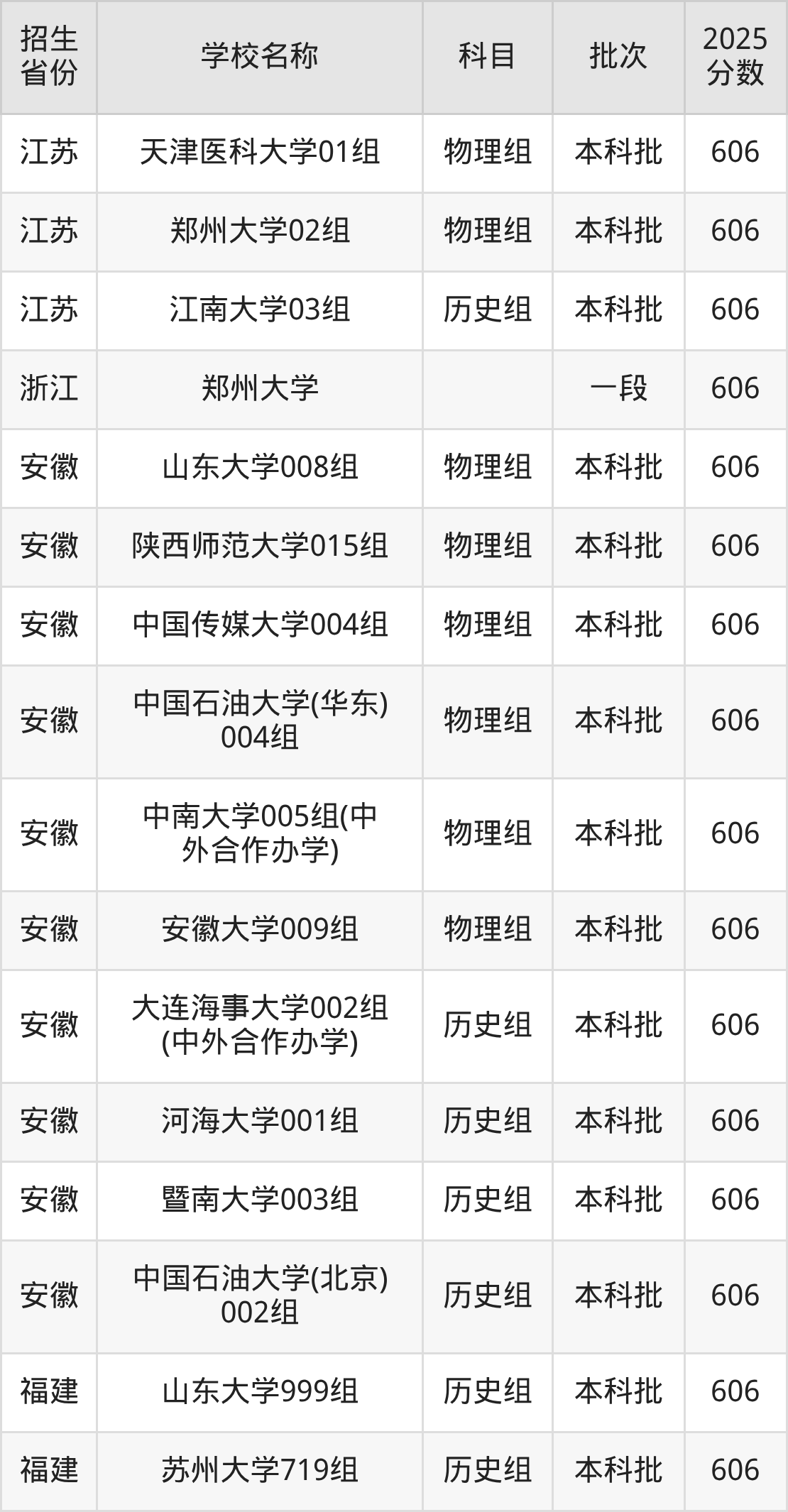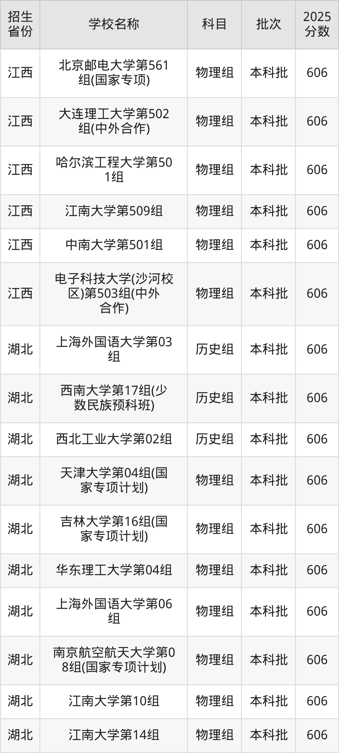 筛选全国各省2025年录取分数线为606分的211大学如下: